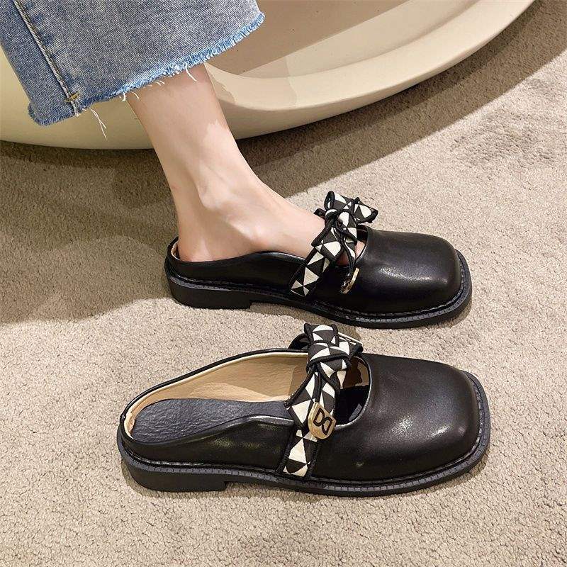 Ретро британский стиль туфли Мюли женские 2025 новые на плоской подошве универсальные милые с бантом темпераментные с закрытым носком полушлепанцы тренд