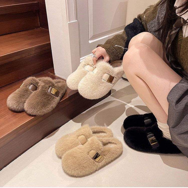 Сумка с плоским дном, голова, пушистые тапочки для женской верхней одежды, новинка 2025, осенне-зимнее ощущение, тапочки из кроличьего меха, плюшевые, хлопковые, на одном педале