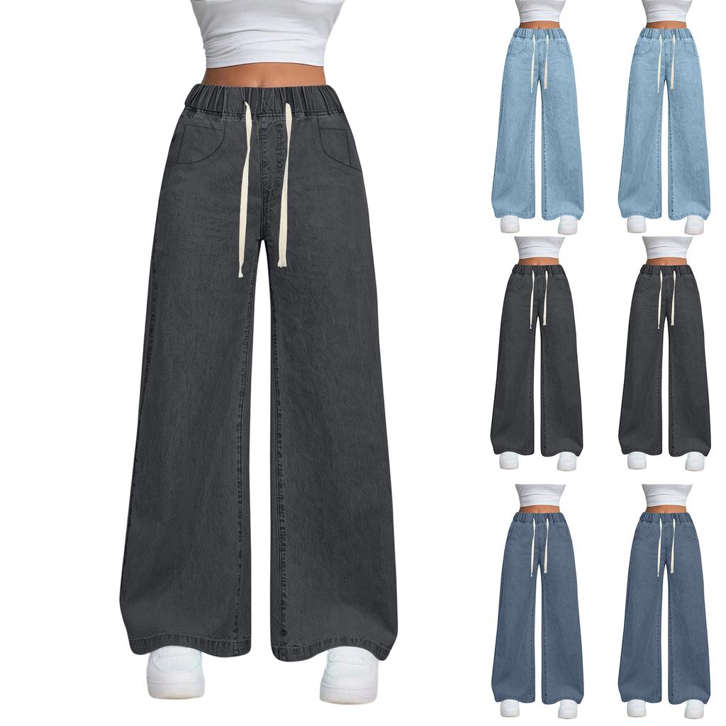 Женские джинсы с высокой талией, на кулиске, широкие прямые штанины, свободные, повседневные