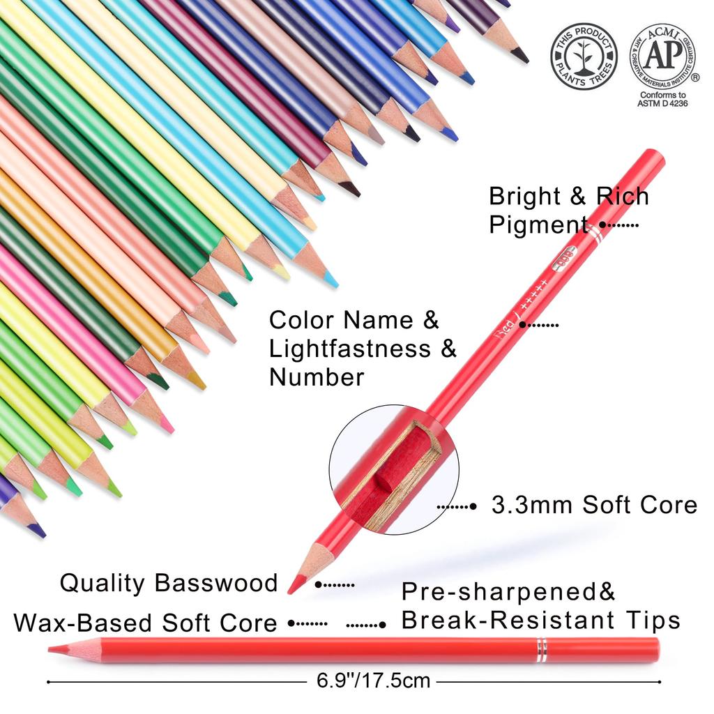 【Художественные цветные карандаши высокого качества для взрослых】Каждый цветной карандаш предварительно заточен и промаркирован уникальным номером, названием цвета и рейтингом светостойкости для легкой идентификации цвета. Шелковисто-гладкий и бархатистый мягкий грифель карандаша обеспечивает множество яркого цвета с насыщенным пигментом и ультра-гладким нанесением.