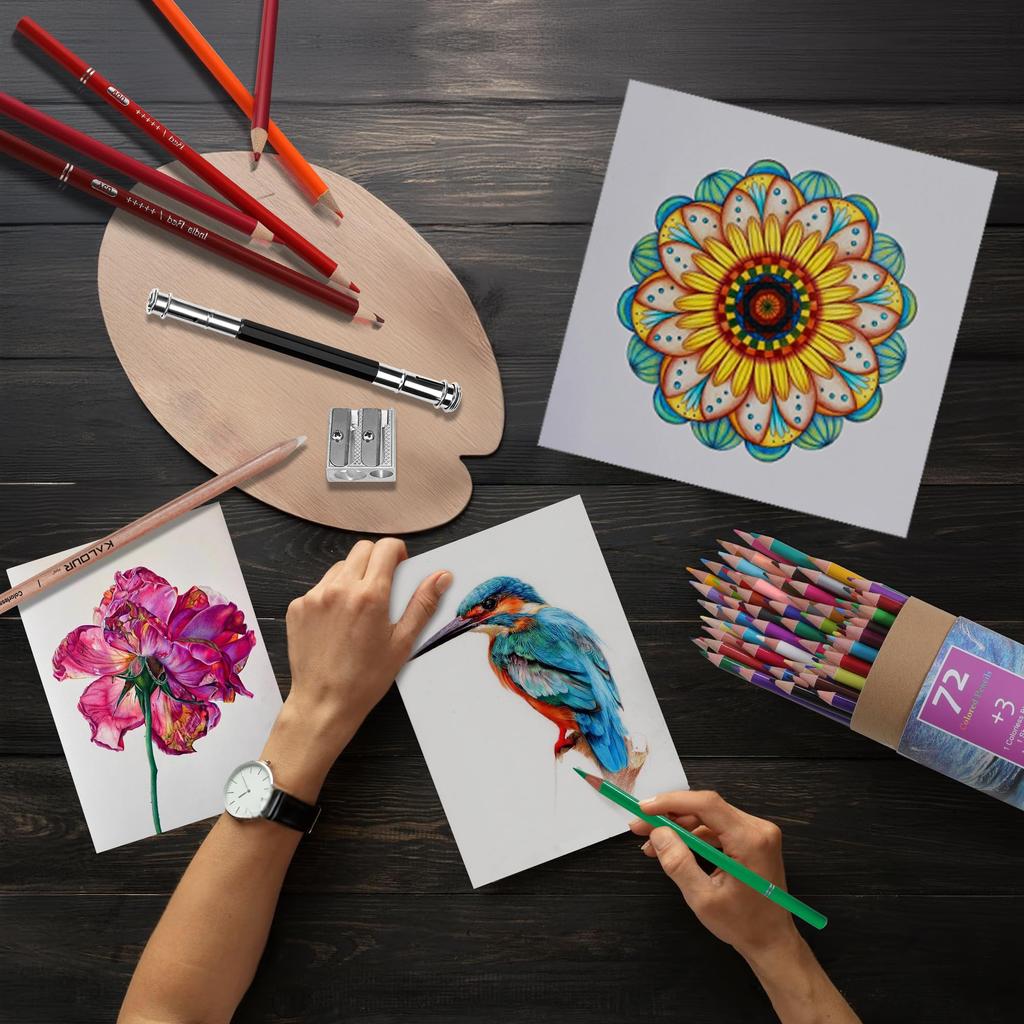 Полный набор цветных карандашей: 72 цветных карандаша с мягким грифелем, 1 бесцветный карандаш-блендер, 1 удлинитель для карандаша и 1 металлическая точилка. Независимо от того, новичок вы или профессиональный художник, в этом наборе есть все необходимое для создания потрясающих произведений искусства.. Это идеальное дополнение к вашим художественным принадлежностям и идеально подходит для раскрасок для взрослых, рисования, эскизов и многого другого.