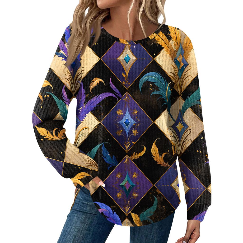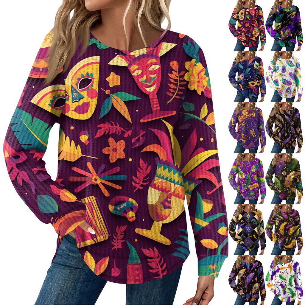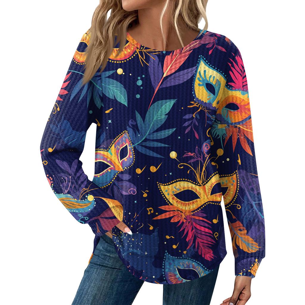 Женская мода Свободный топ с длинным рукавом и карнавальным принтом, с круглым вырезом, повседневный