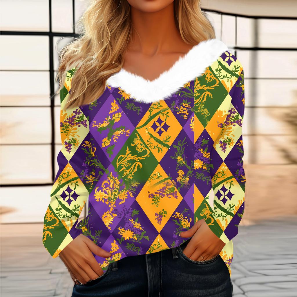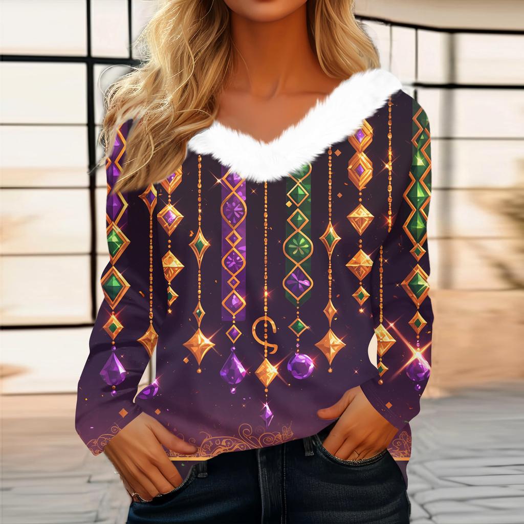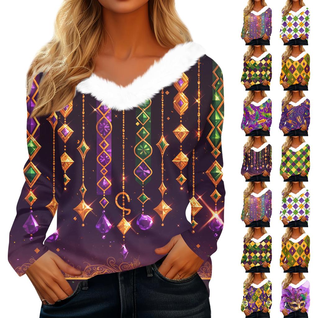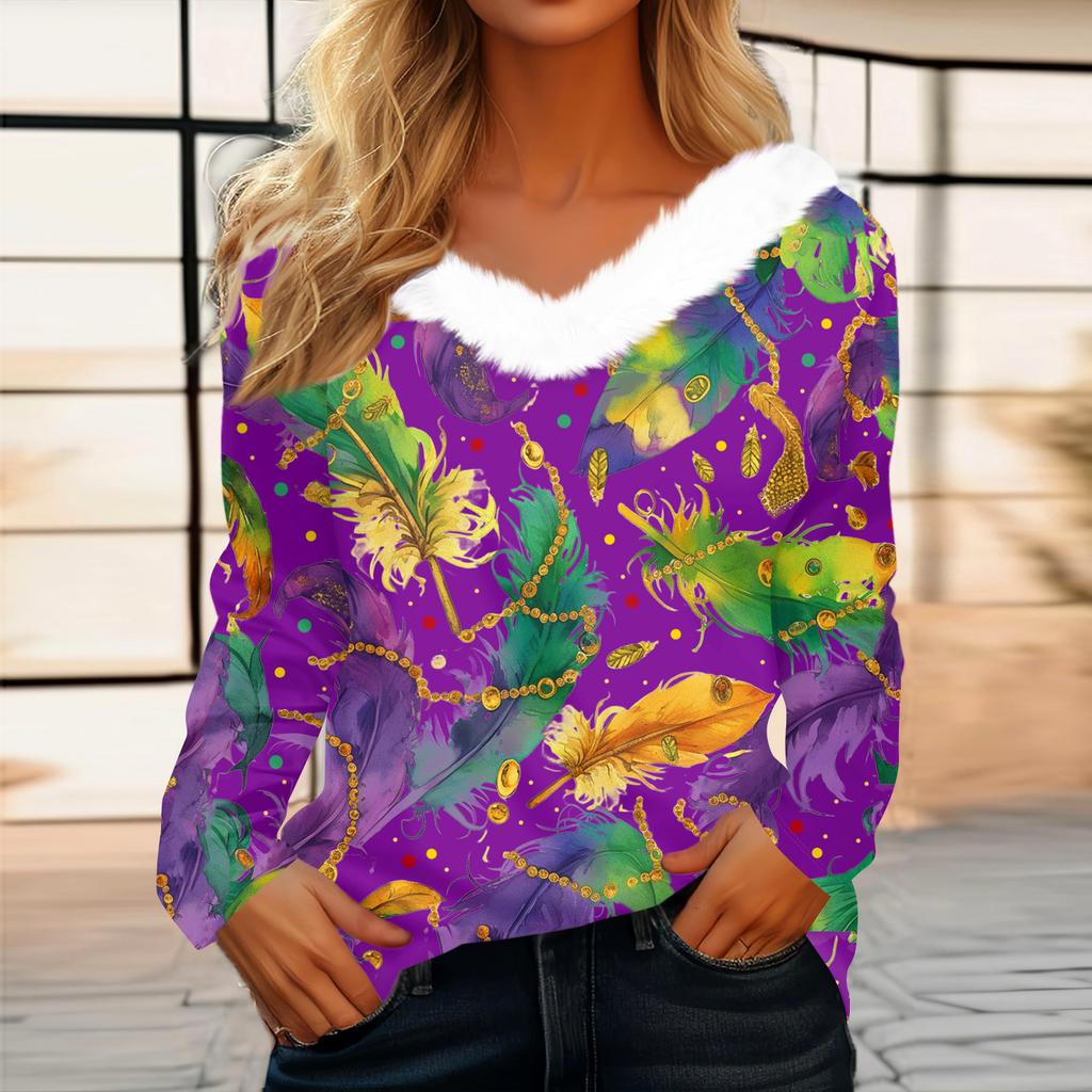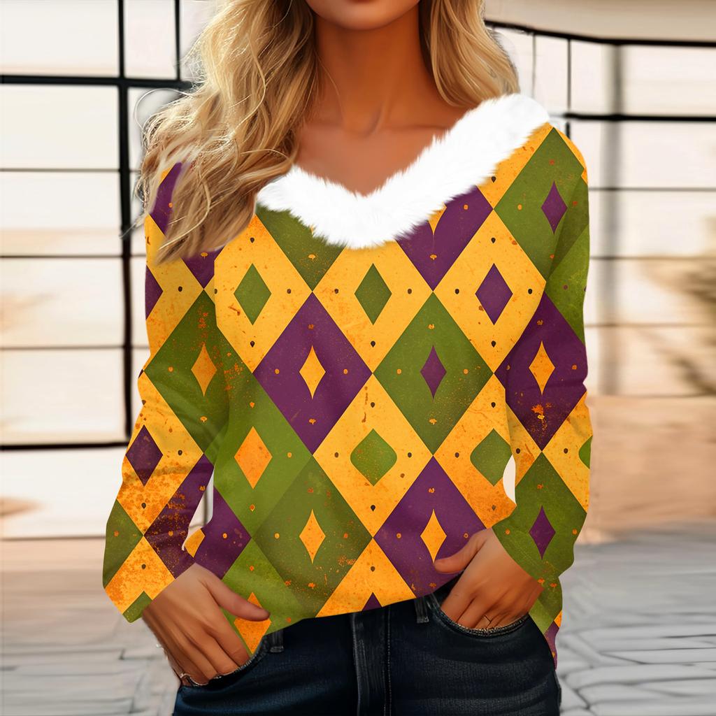 Женский свободный повседневный топ с длинными рукавами и принтом из плюша с V-образным вырезом, топ с длинными рукавами