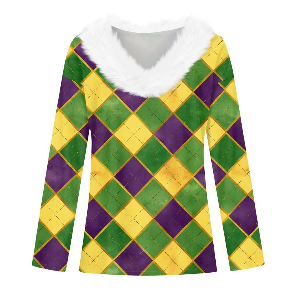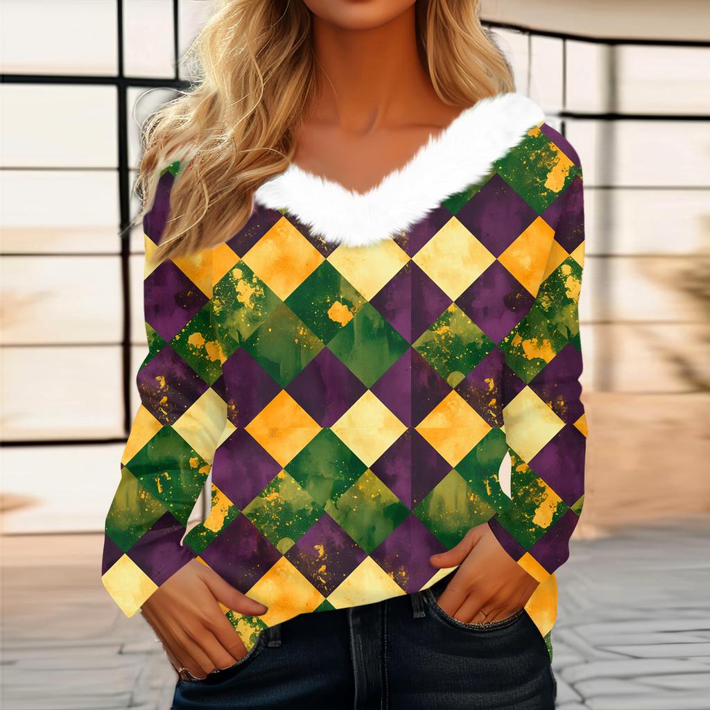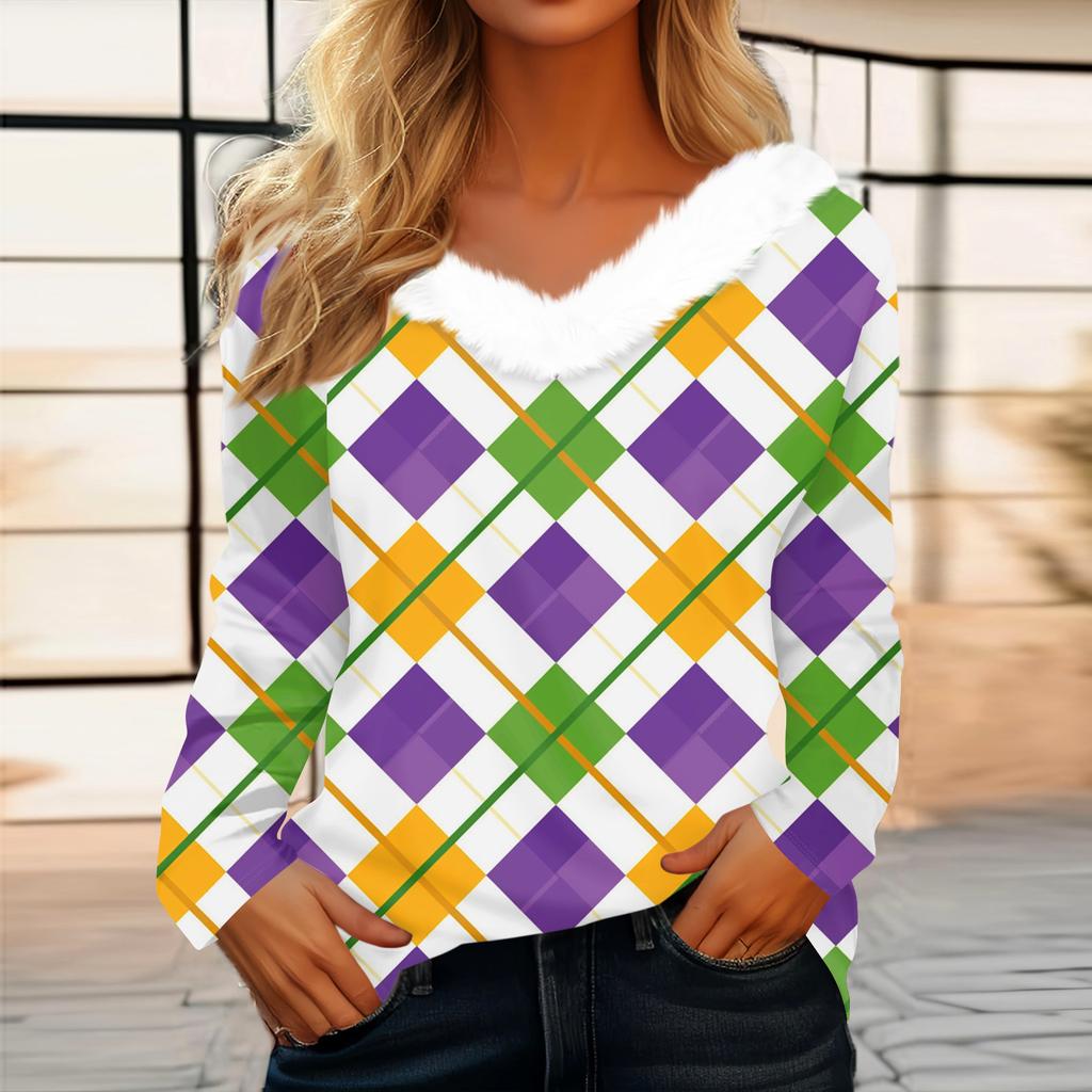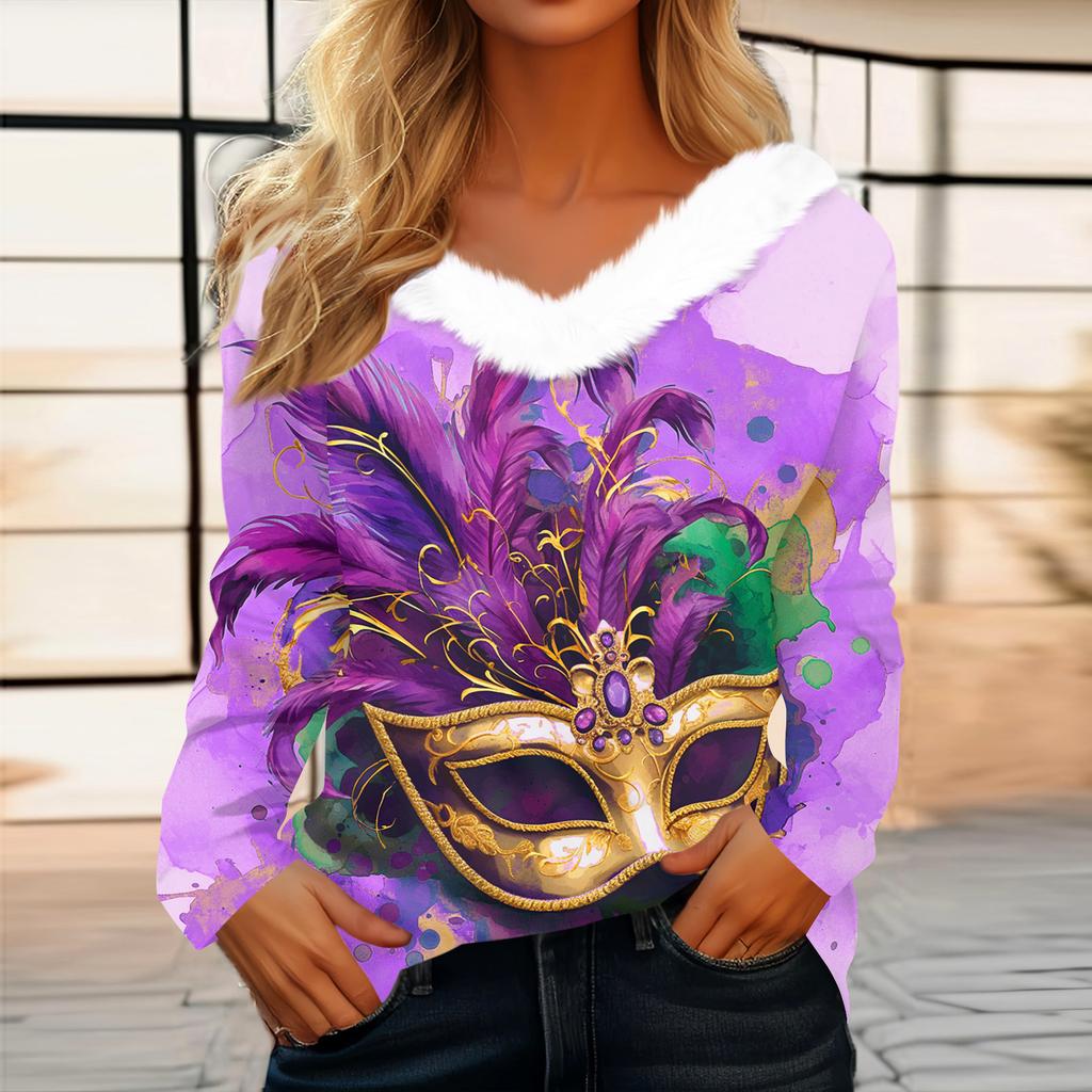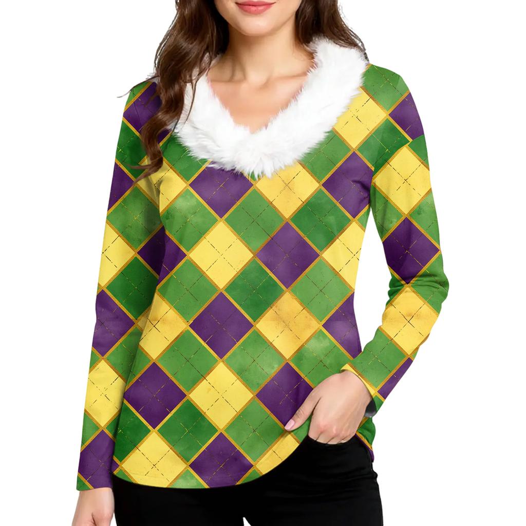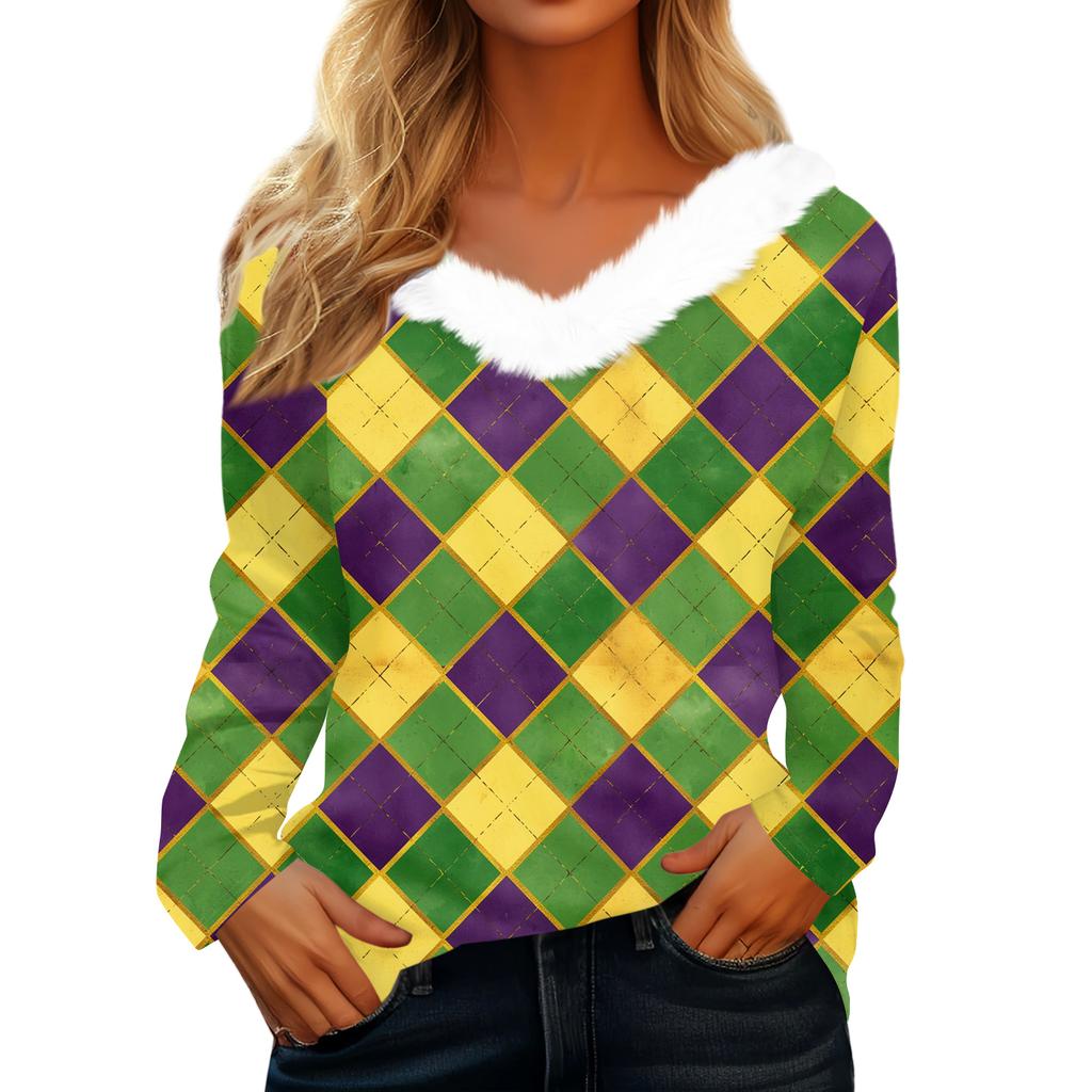 Женский свободный повседневный топ с длинными рукавами и принтом из плюша с V-образным вырезом, топ с длинными рукавами