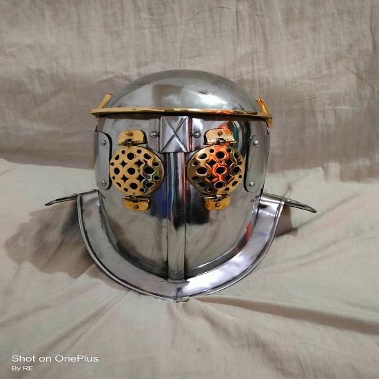 Представляем провокационный шлем Gladiator: Раскройте дух древних воинов с помощью этого замечательного изделия, в котором гармонично сочетаются история и современное мастерство.. Этот боеспособный шлем, изготовленный из прочной мягкой стали толщиной 2 мм, отдает дань уважения доблести и стойкости гладиаторов, что делает его ярким дополнением к любой коллекции или идеальным выбором для исторических реконструкций. (Историческая средневековая битва), и СКА (Общество творческого анахронизма) события.