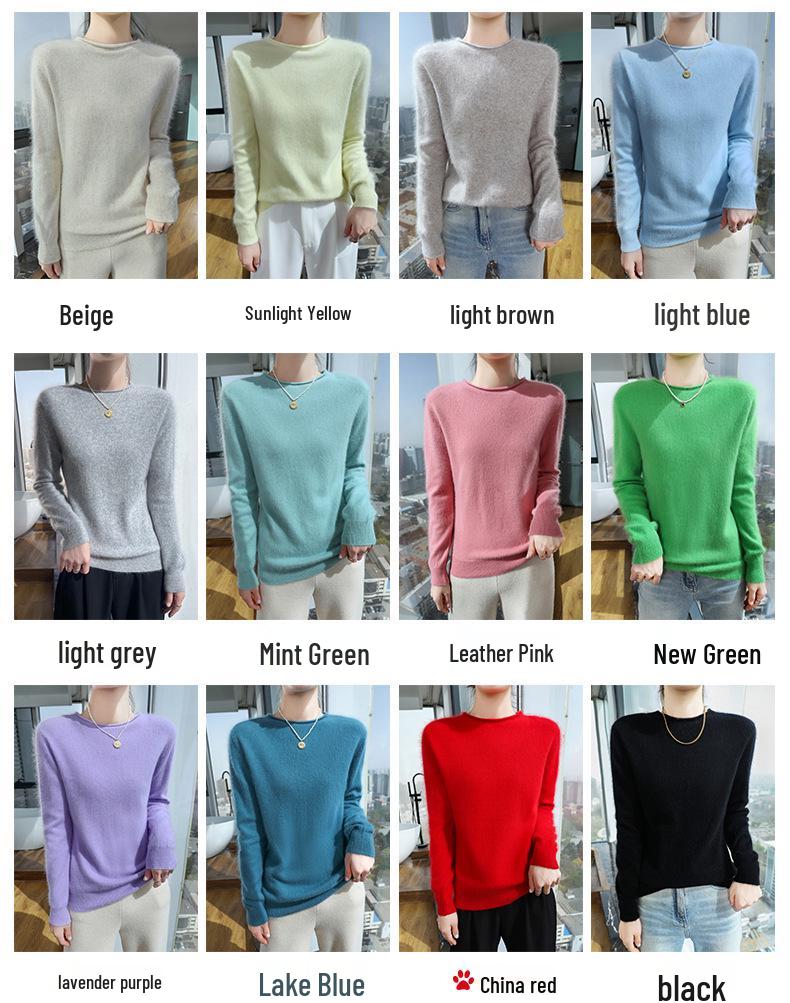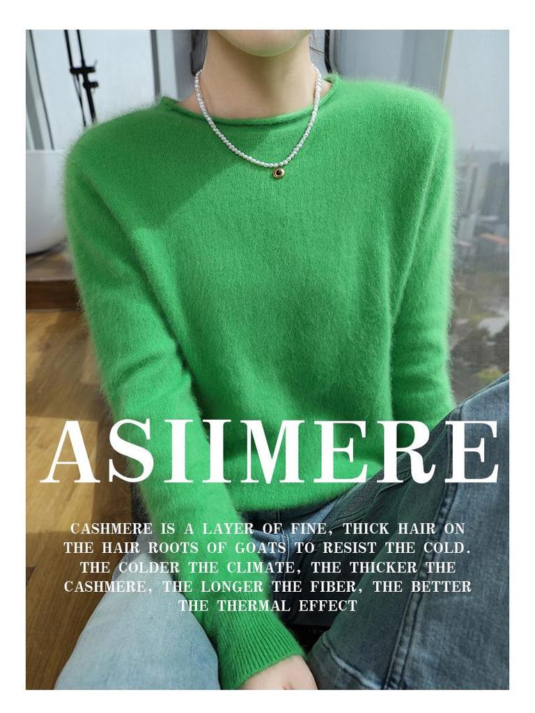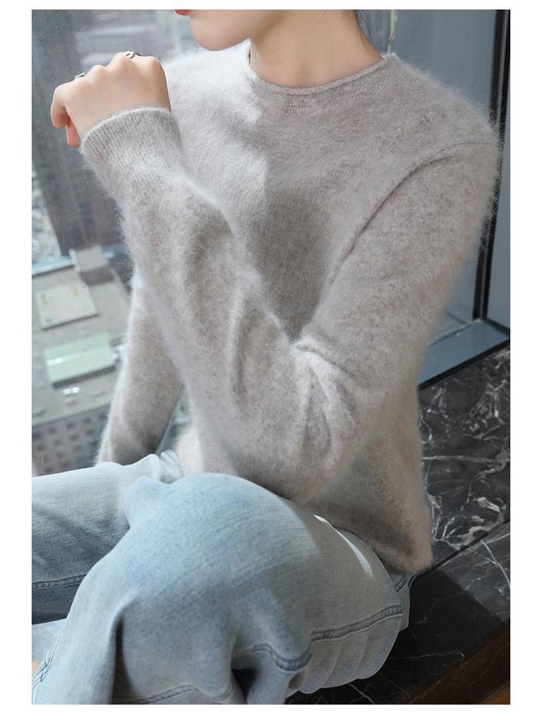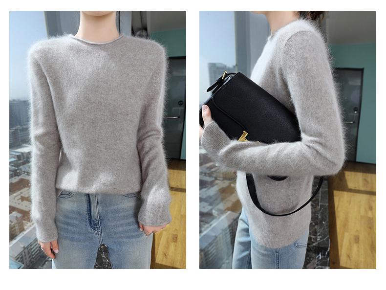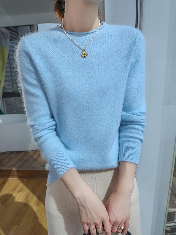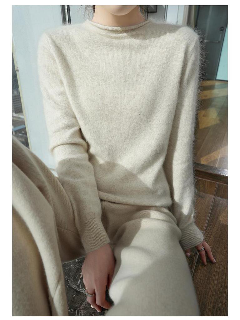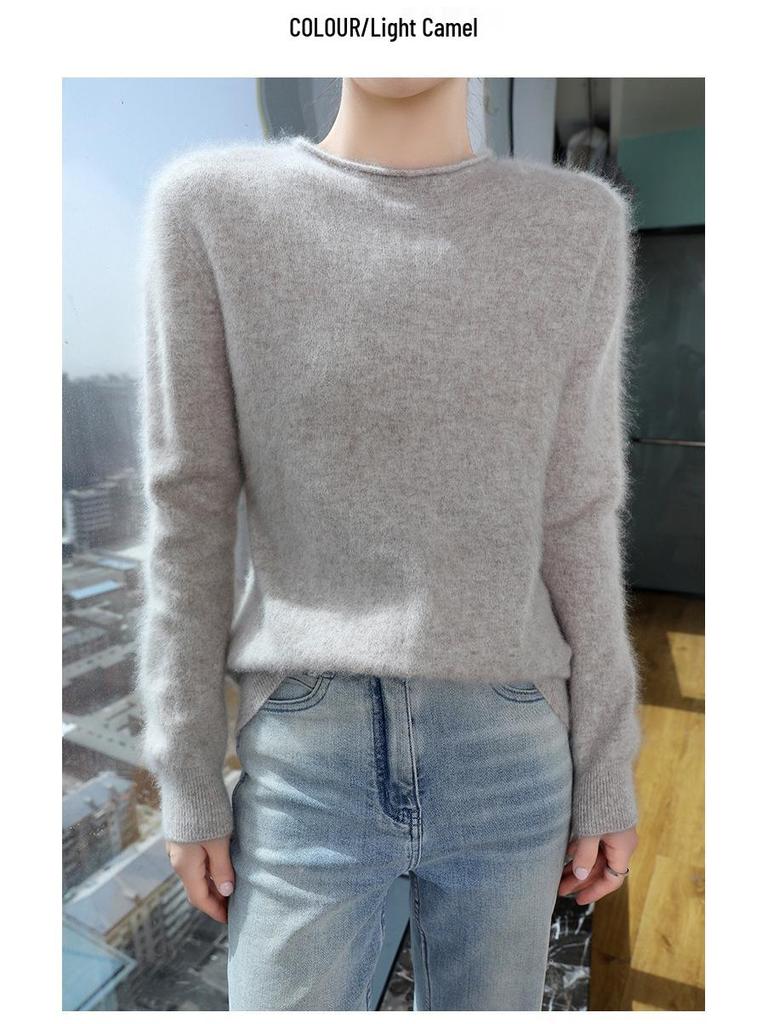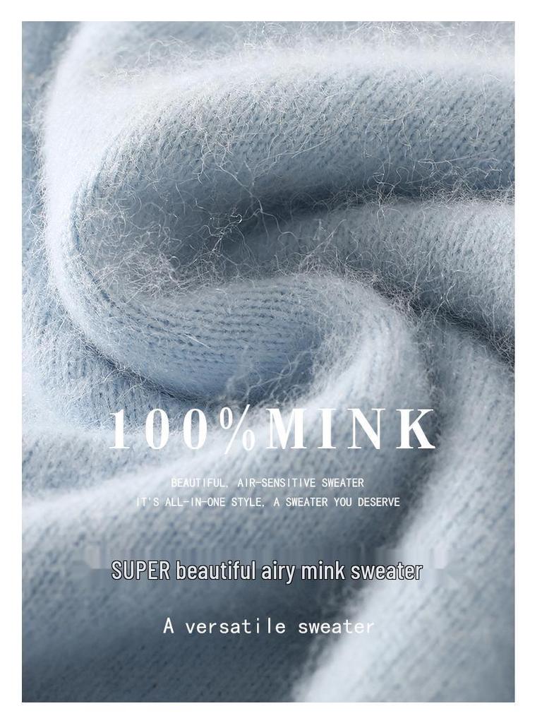Женский свитер из норки и кашемира 2025: Трикотажный пуловер с полувысоким воротником и подвернутым краем для весны и осени