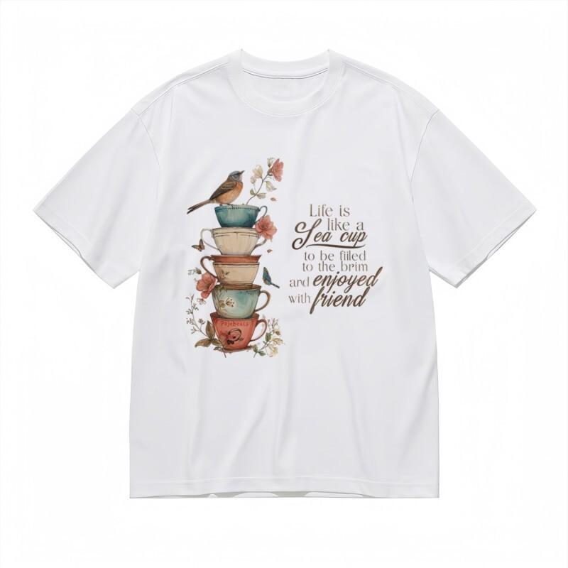 Women's Fashion Classic T-Shirt Floral Teapot Friendship Slogan White Cotton Tee