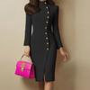 Женская модная элегантность однотонное платье с длинными рукавами, воротником-стойкой, приталенное, на металлических пуговицах, с разрезом — купить товар онлайн с бесплатной доставкой по всему миру!