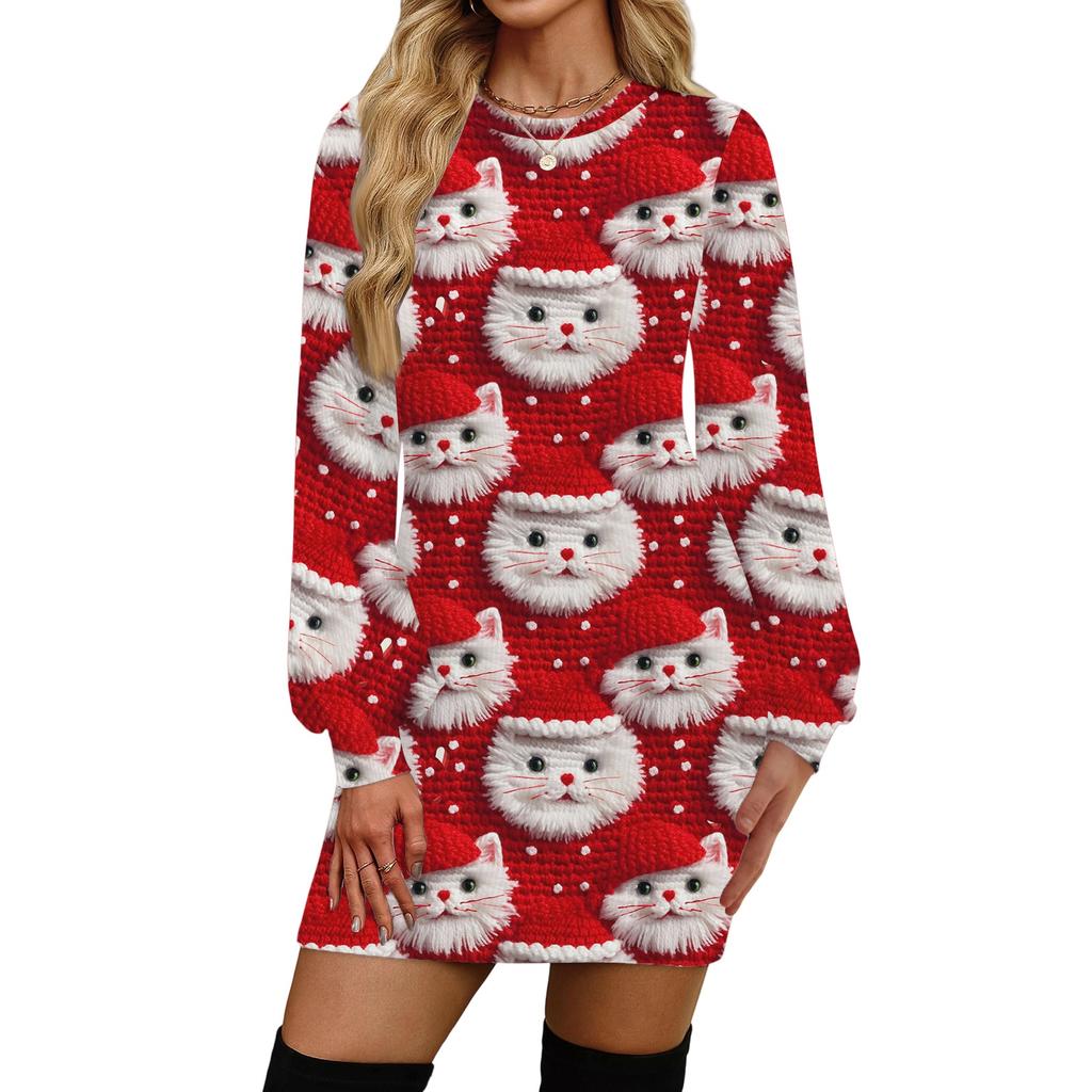 Женское модное повседневное платье с рождественским принтом, круглым вырезом и длинным рукавом