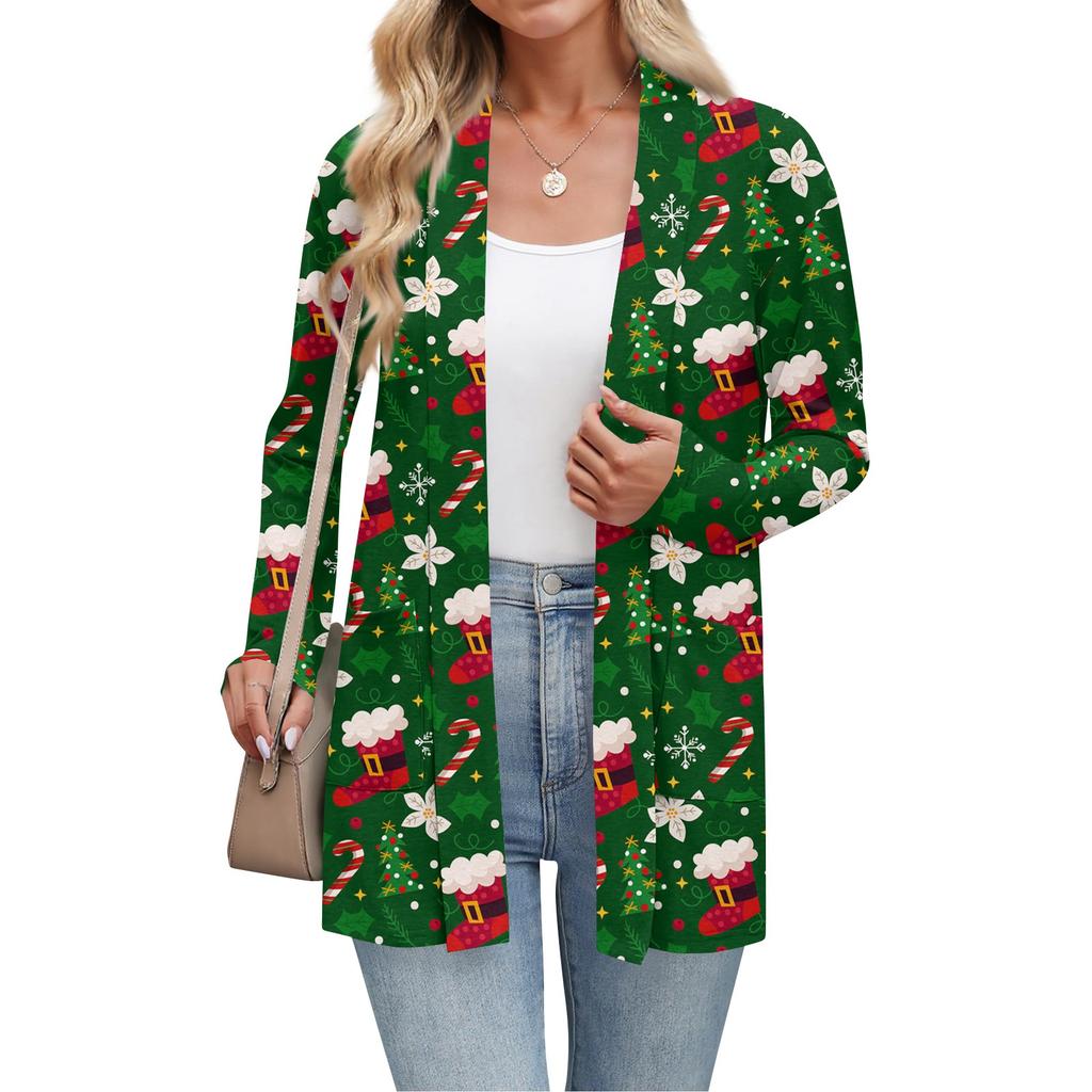 Женский рождественский кардиган с принтом, легкий, с длинными рукавами, повседневный, свободного кроя, тонкий, с карманами, куртка-кардиган