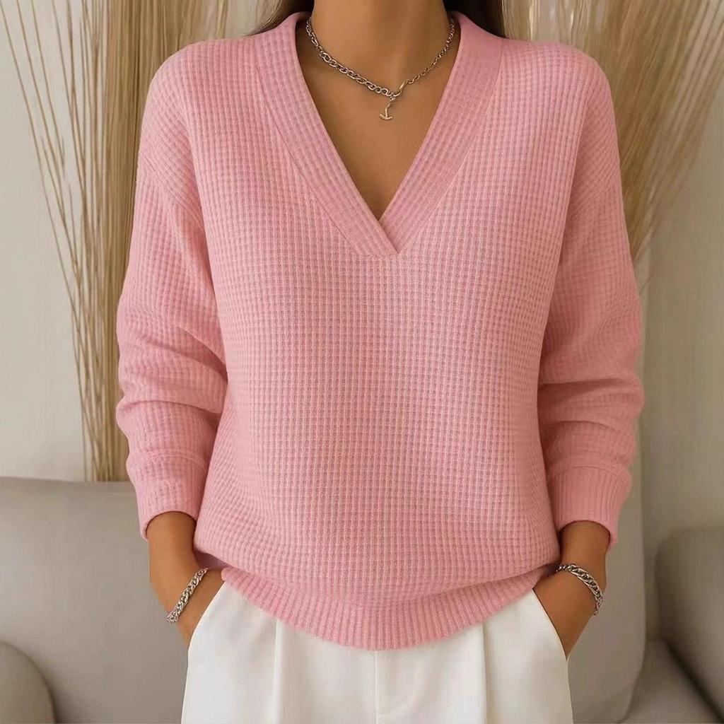 Трансграничный 2025 Осень Вафельная вязка V-образный вырез Однотонный Универсальный Европейский и американский стиль Женский топ