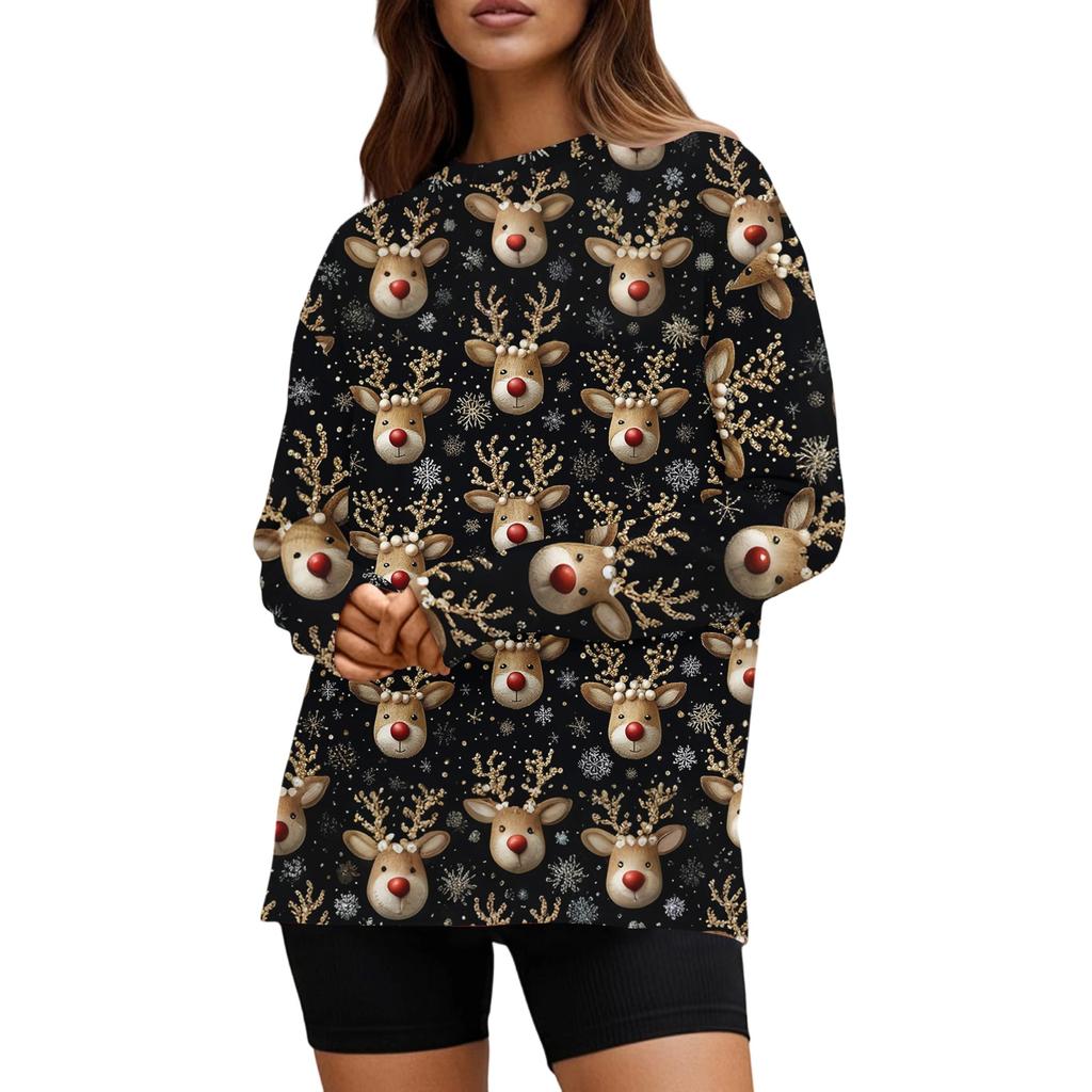 Женская мода Повседневный Рождественский принт Круглый вырез Однотонный Топ с длинным рукавом