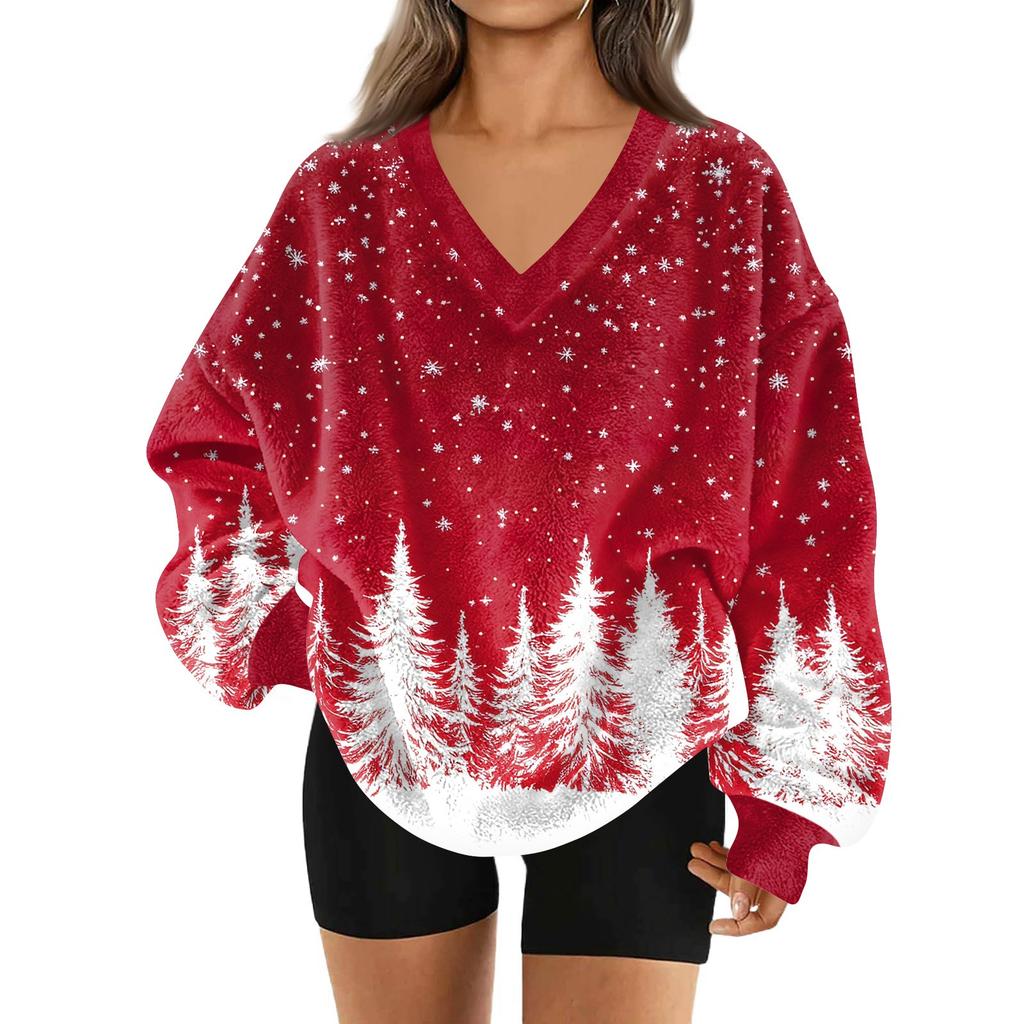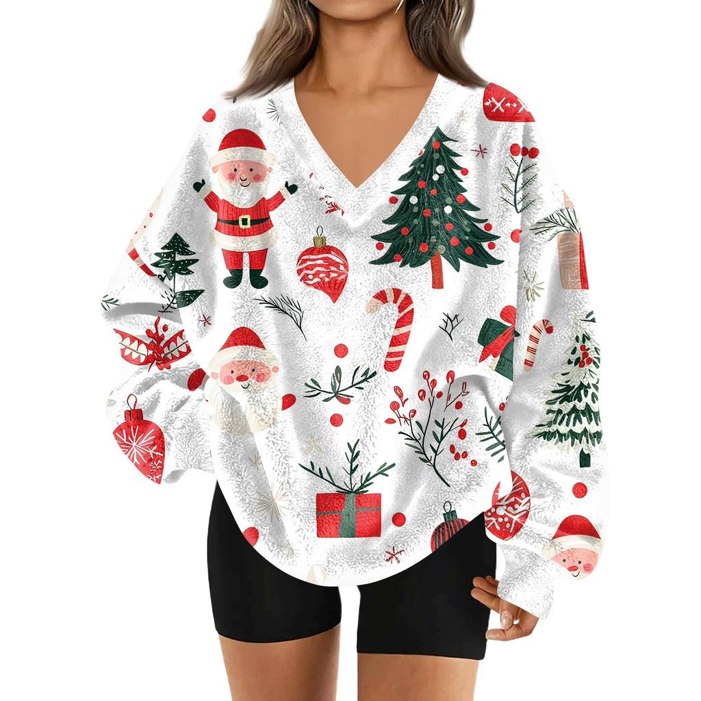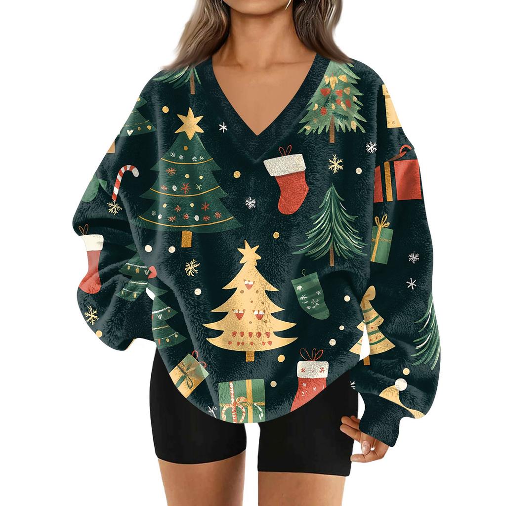 Женская модная повседневная толстовка с длинным рукавом и V-образным вырезом с рождественским принтом