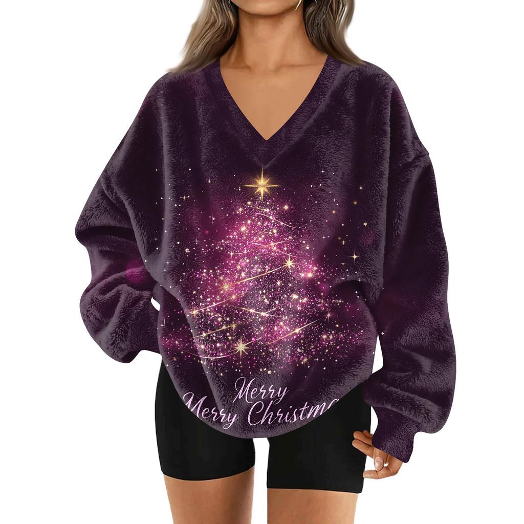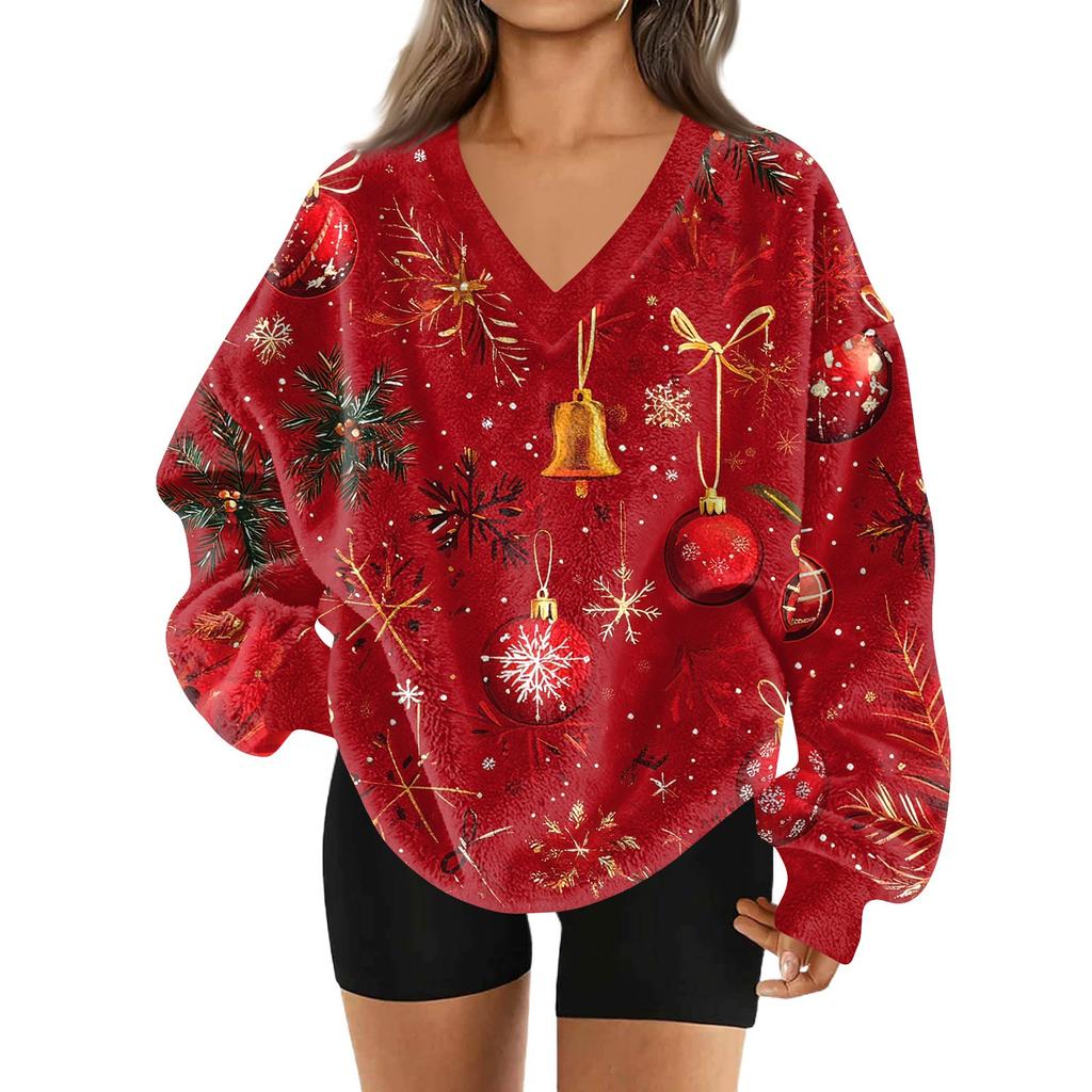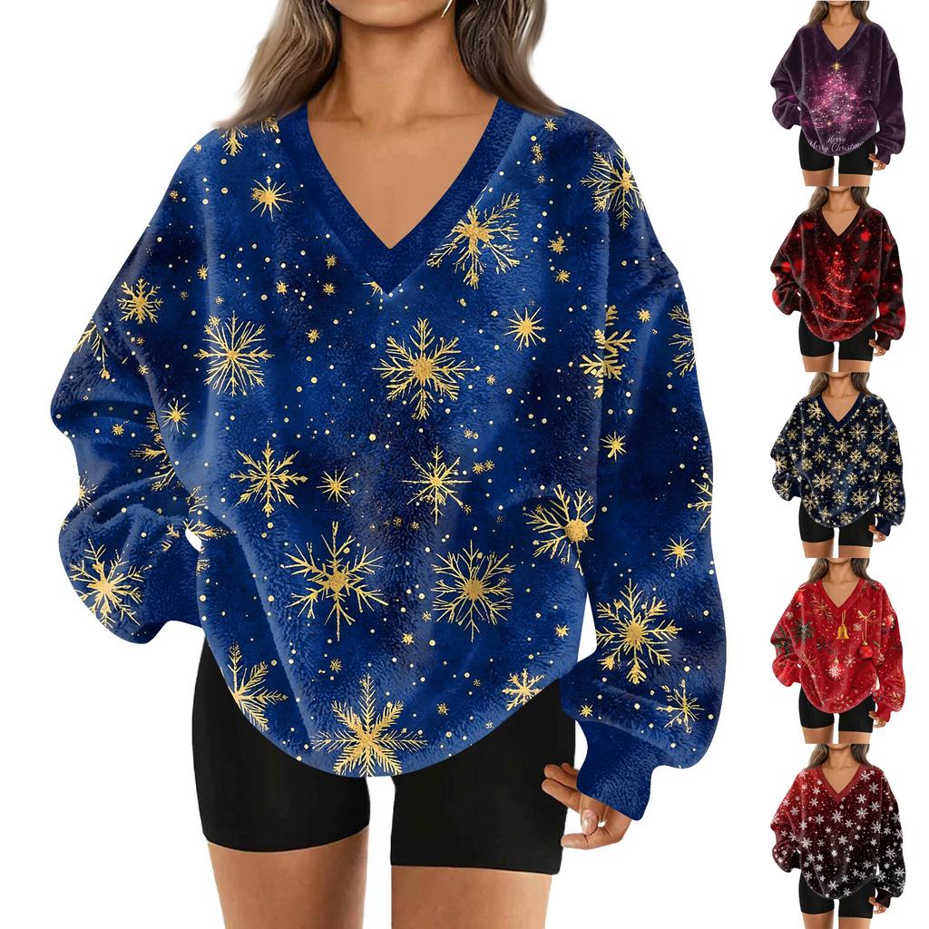 Женская модная повседневная толстовка с длинным рукавом и V-образным вырезом с рождественским принтом