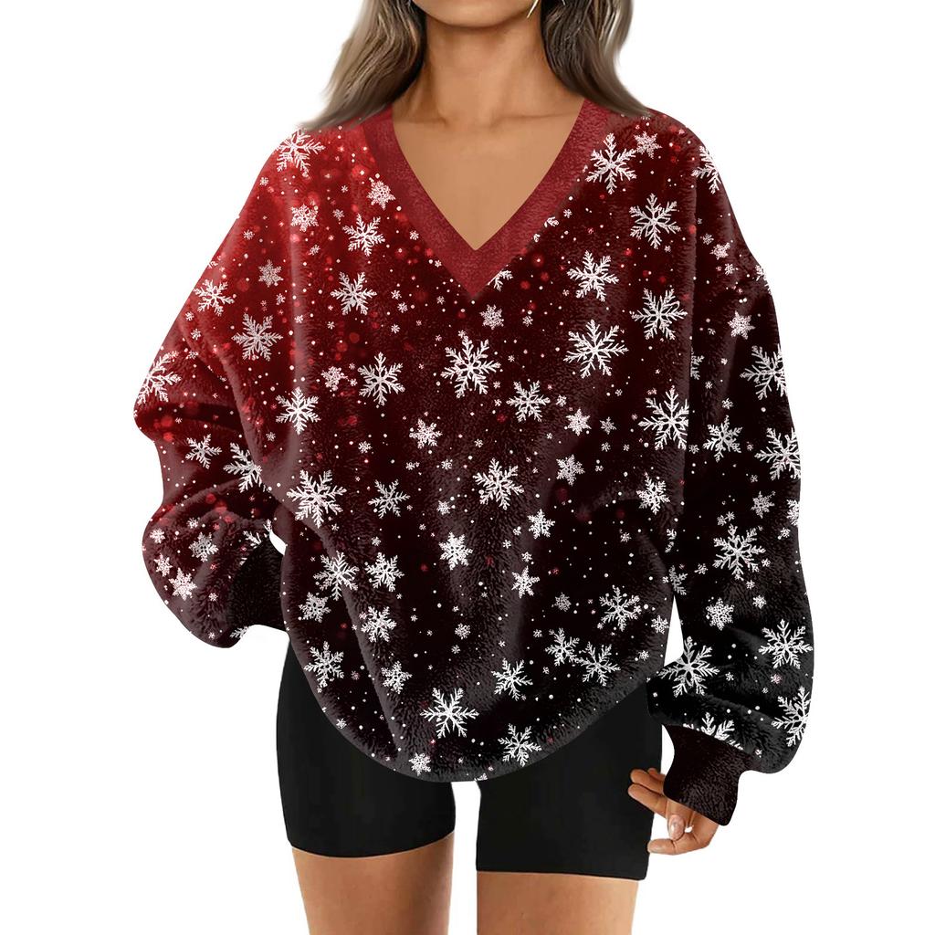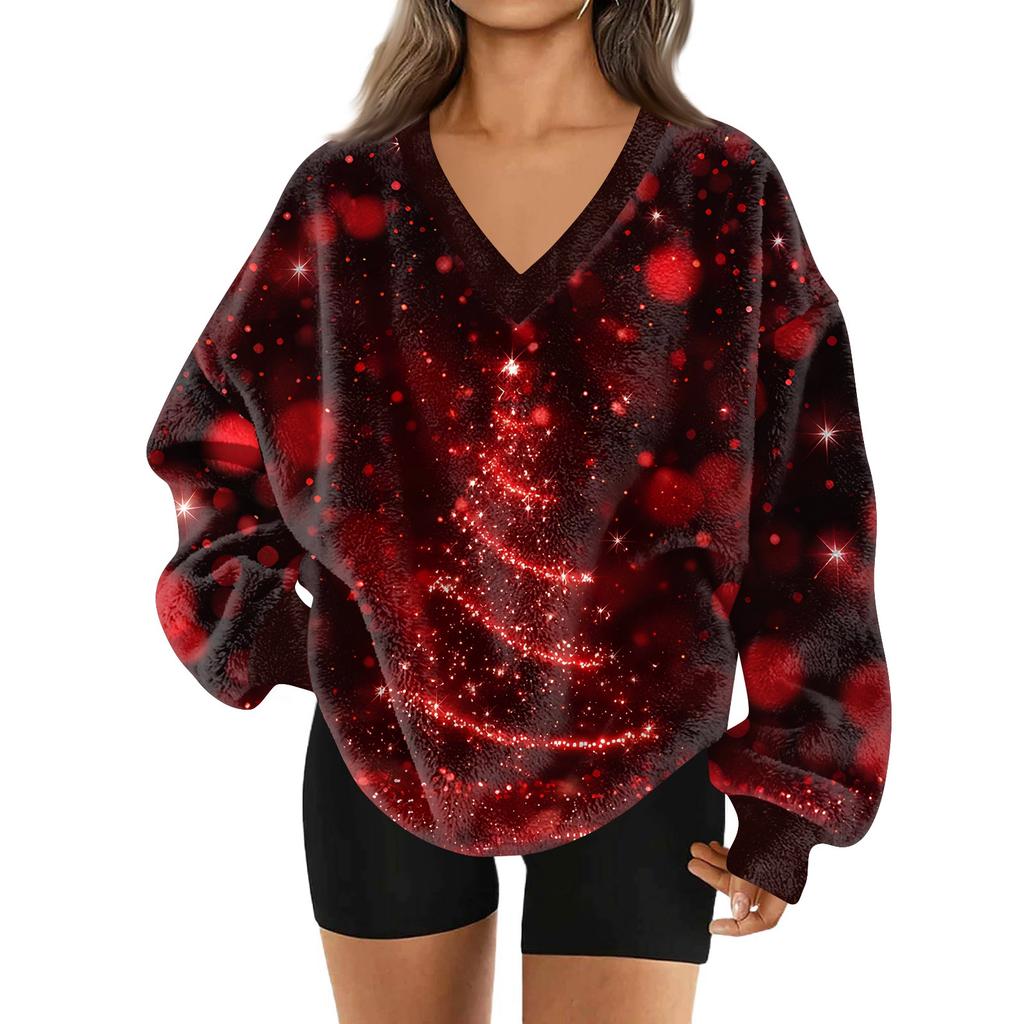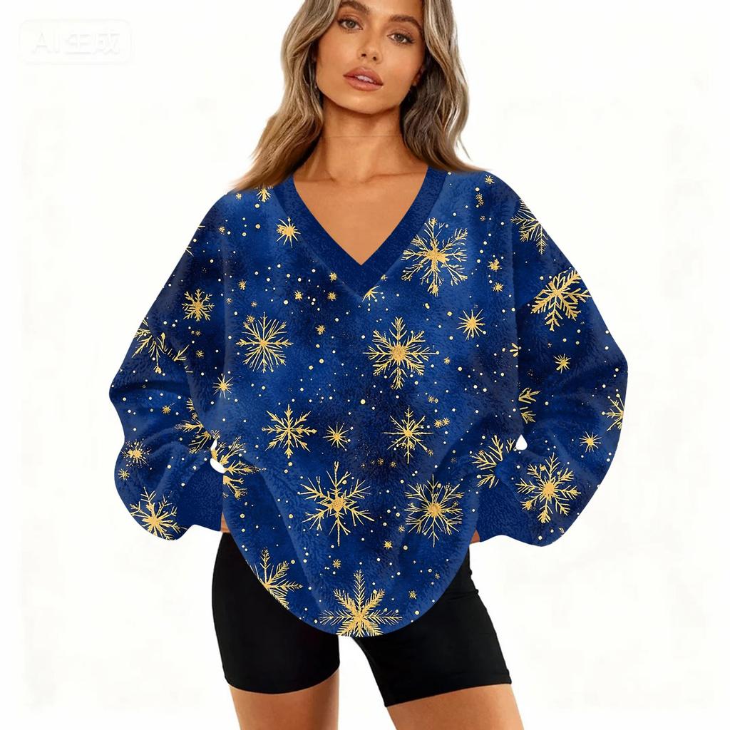 Женская модная повседневная толстовка с длинным рукавом и V-образным вырезом с рождественским принтом