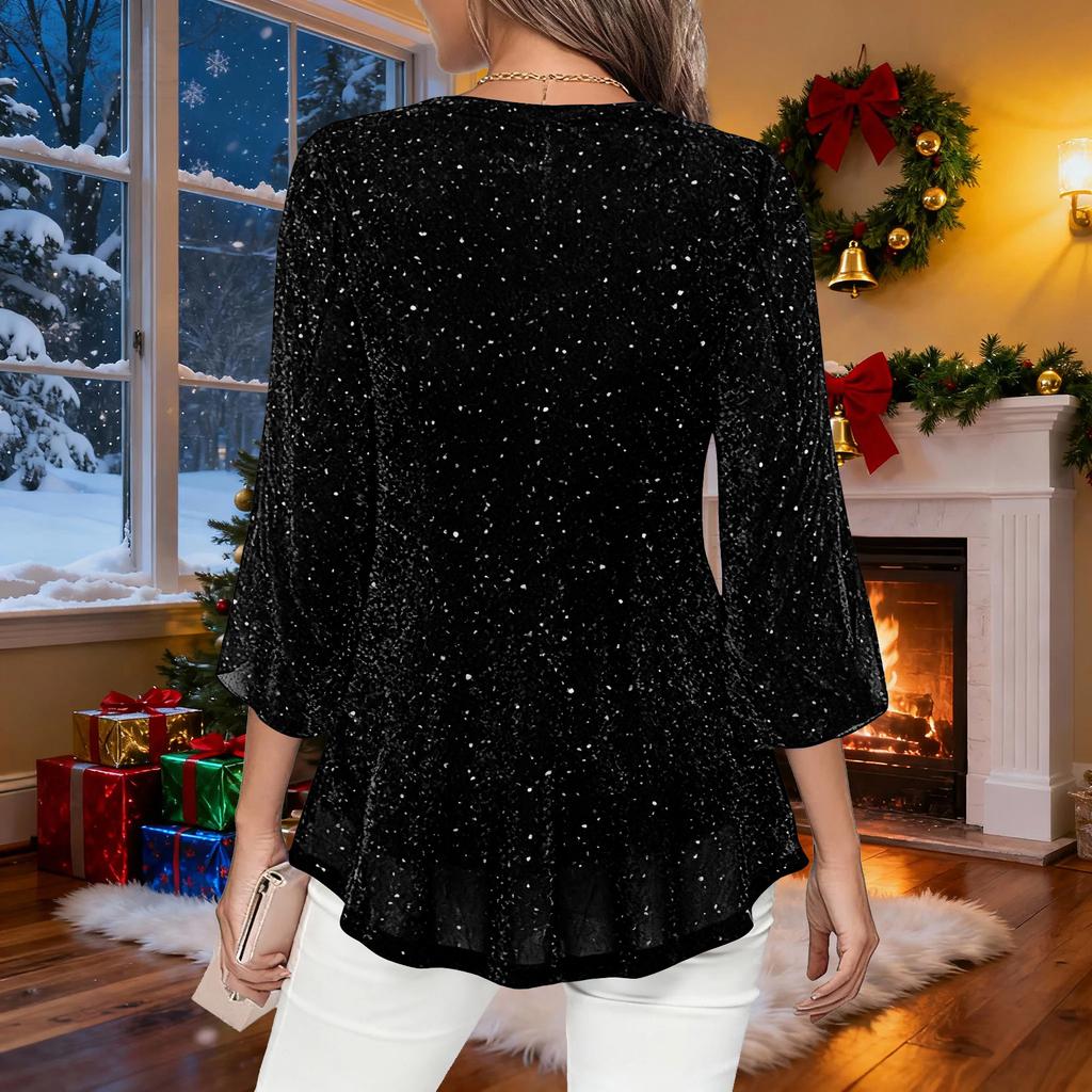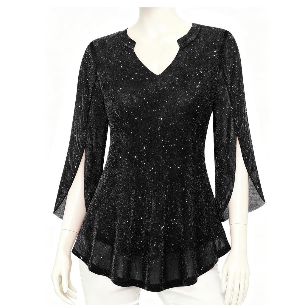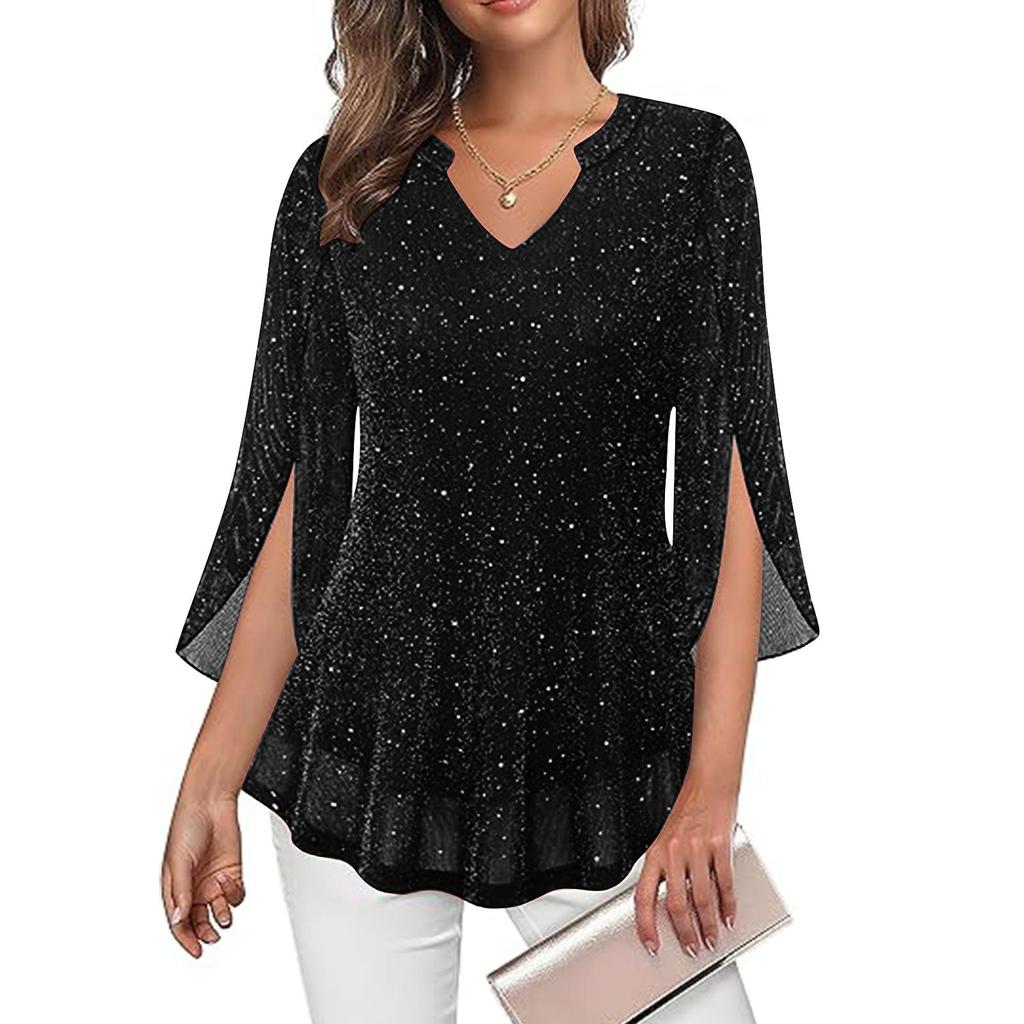 Женская модная двухслойная сетчатая блузка с V-образным вырезом и рукавами три четверти-колокол свободного кроя