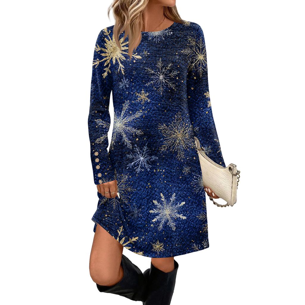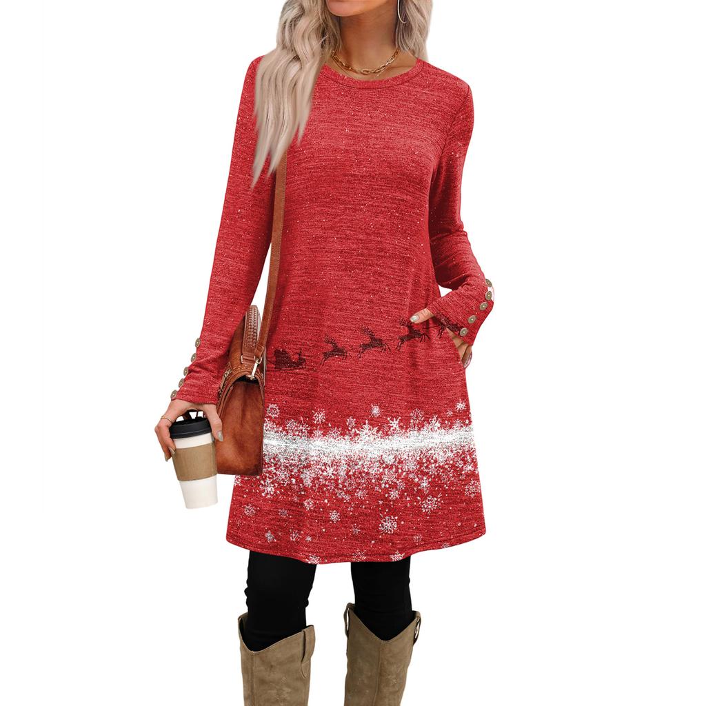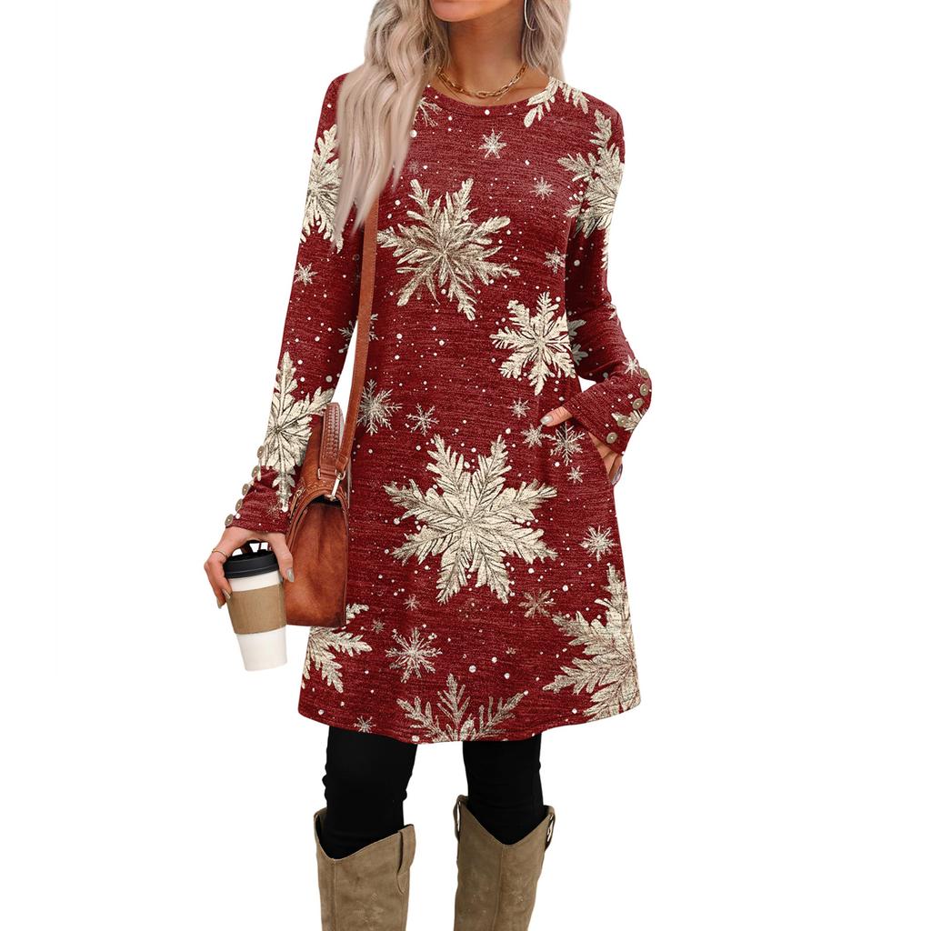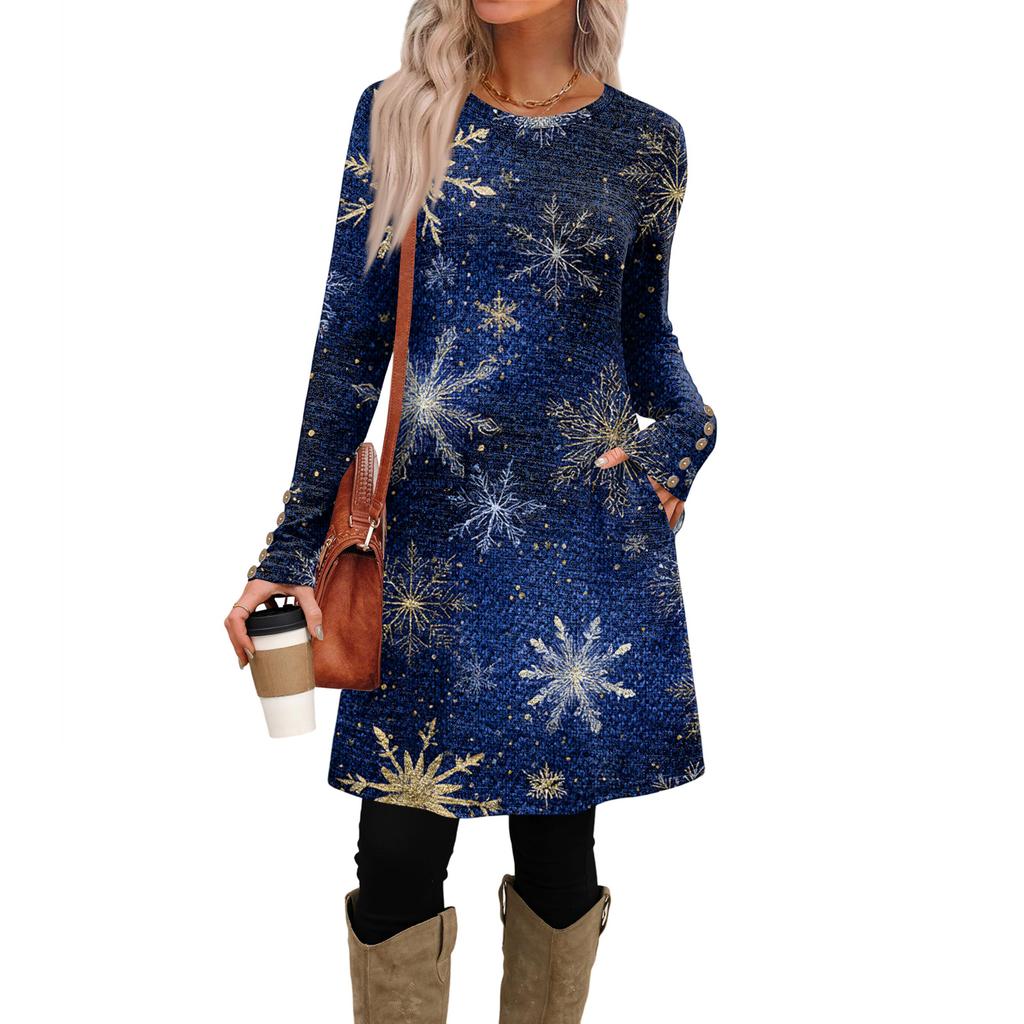 Женское модное повседневное платье с карманами, декоративными пуговицами, рождественскими принтами, круглым вырезом и длинными рукавами