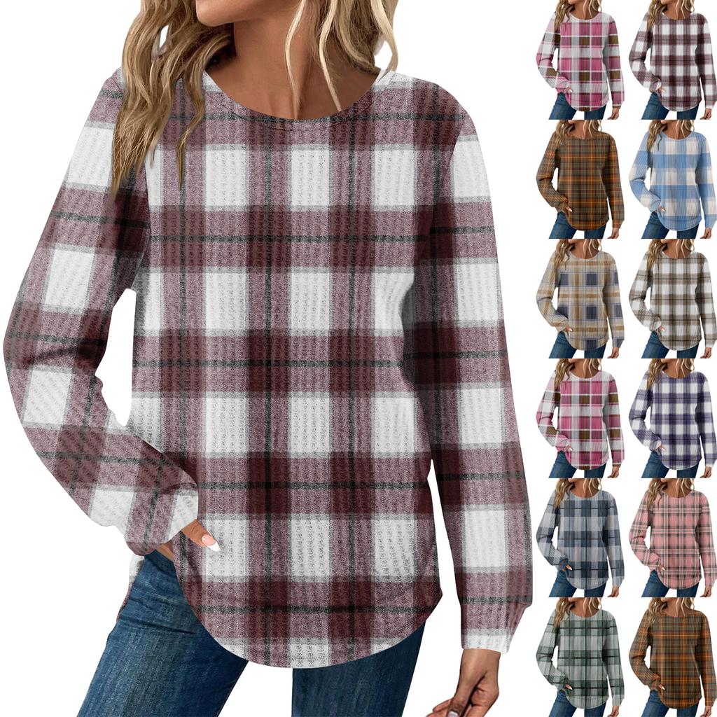 Женский повседневный топ свободного кроя с круглым вырезом и длинными рукавами в клетку — купить товар онлайн с бесплатной доставкой по всему миру!
