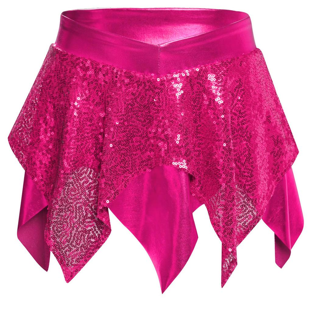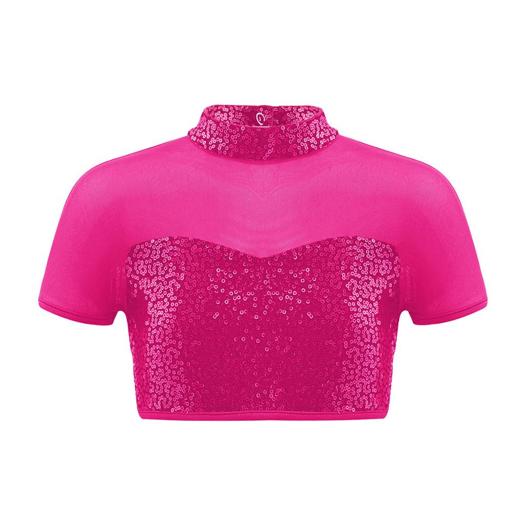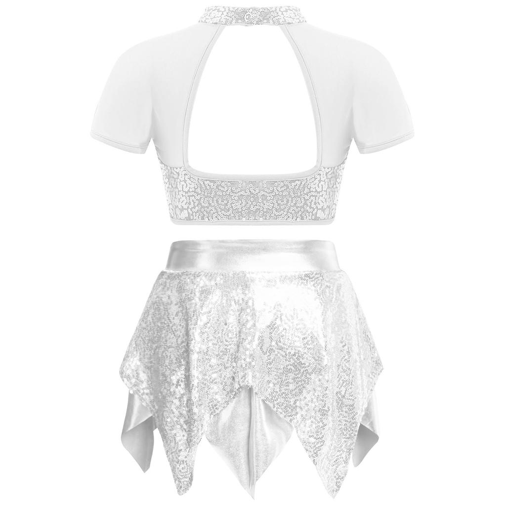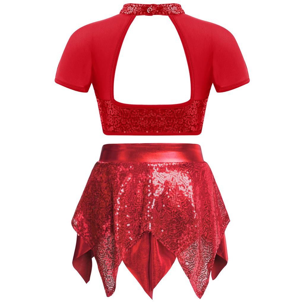 Костюм для джазового танца для девочек, топ-кроп с сетчатой вставкой, вырезом на спине и блестящими пайетками, юбка с неровным подолом