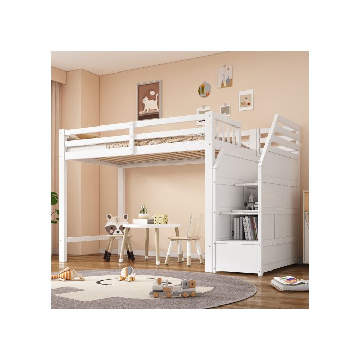 Lit mezzanine - MUVOE - 90x200 cm - Bois massif - Échelle de rangement - Garde-corps sécurisé — купить товар онлайн с бесплатной доставкой по всему миру!