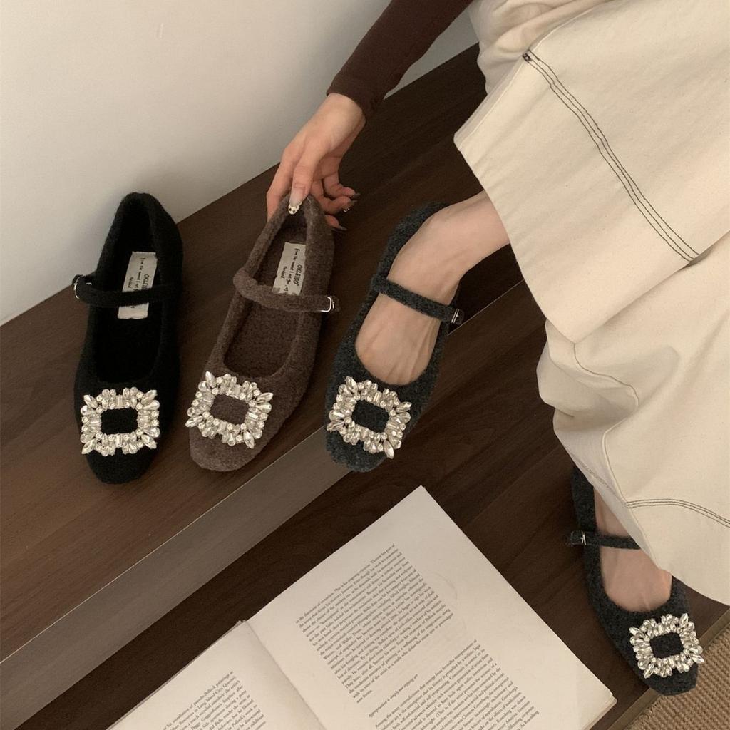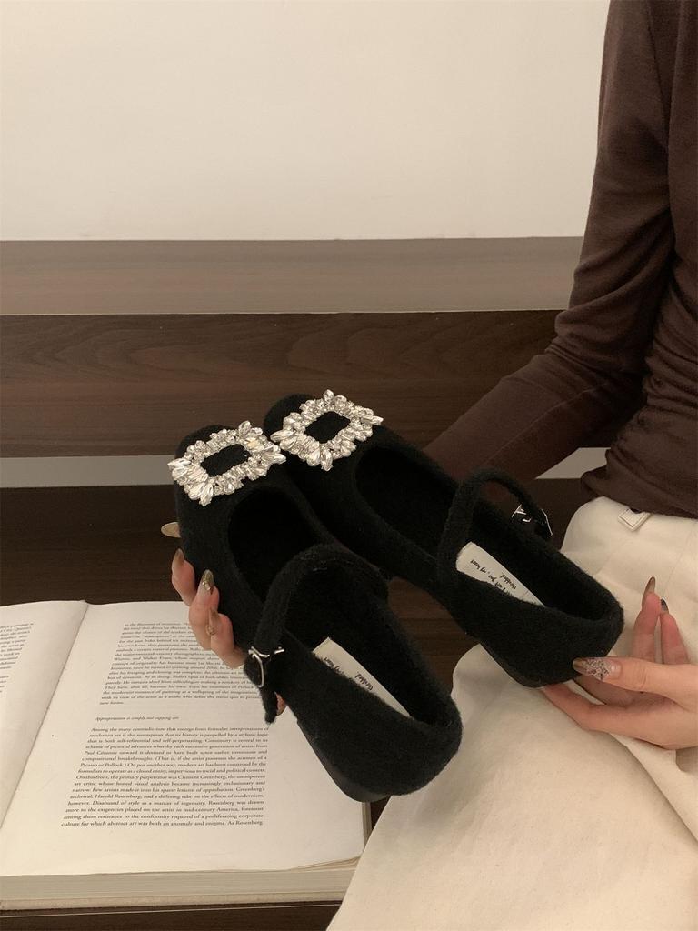 Xiaoxiangfeng шерстяные туфли Мэри Джейн с квадратным носком и стразами, женские осенне-зимние бархатные хлопковые туфли на среднем каблуке, женские туфли-лодочки