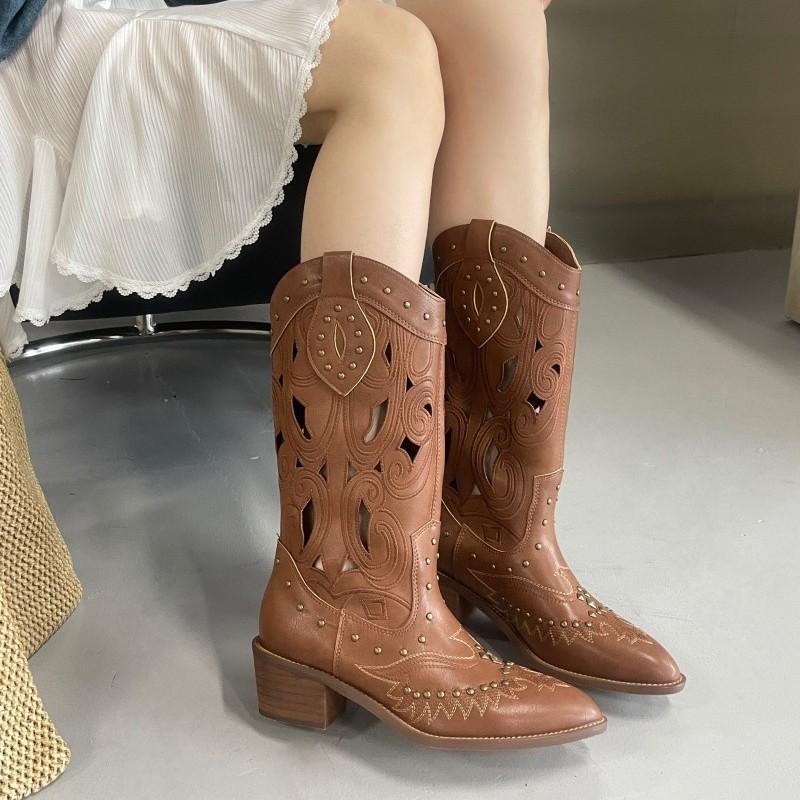 Коричневые полые ковбойские сапоги в западном стиле женские 2025 осень новые вышитые на толстом каблуке сапоги средней высоты ретро с V-образным вырезом сапоги-рыцари