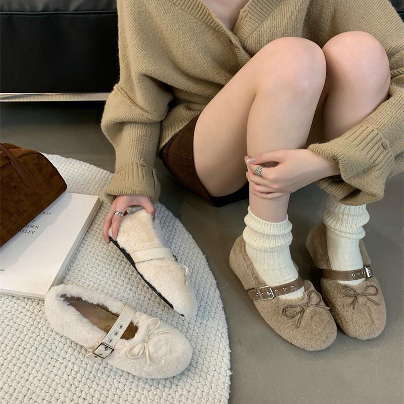 2025 осень и зима удобные универсальные туфли из хлопка с круглым носком и мягкой подошвой, с бантом, ремешком с пряжкой, на плоской подошве, пушистые туфли