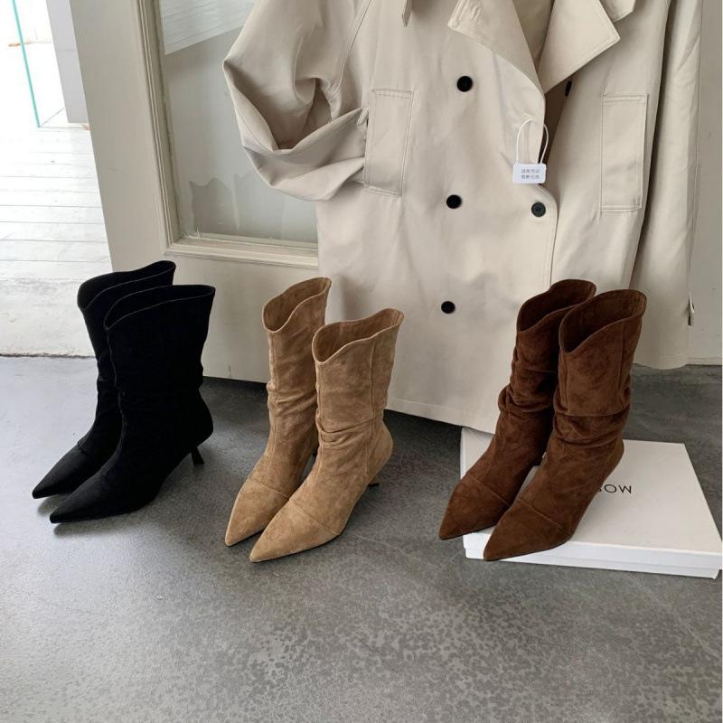 2025 осень и зима тонкий каблук высокий каблук женские сапоги замшевые V-образный вырез средняя голень тонкий острый носок модные сапоги