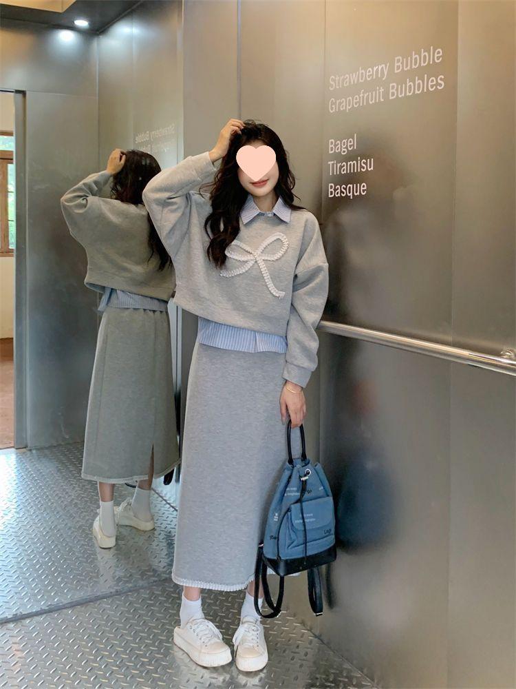 Женский комплект большого размера на осень 2025 года, состоящий из двух предметов: Свитшот с эффектом многослойности и миди-юбка с высокой талией для стройнящего силуэта