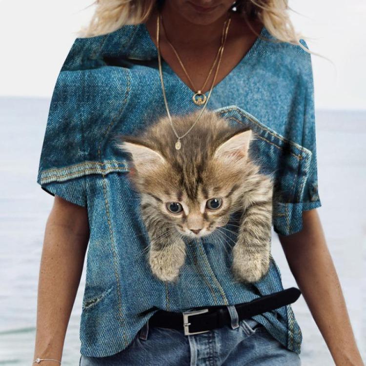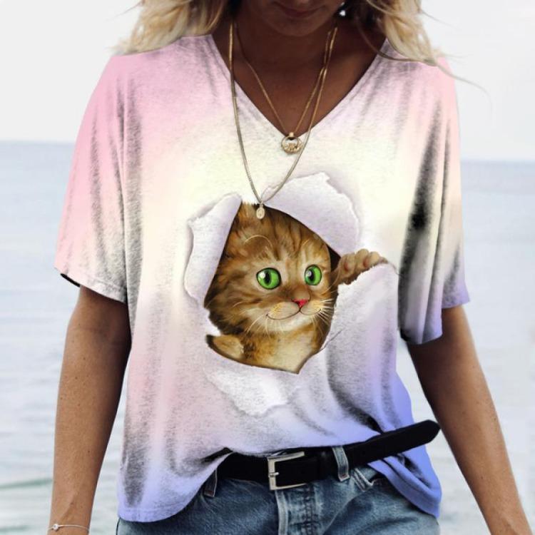 Женская повседневная футболка с коротким рукавом и V-образным вырезом, милый принт кошки, 3D-футболки, праздничный топ для женщин