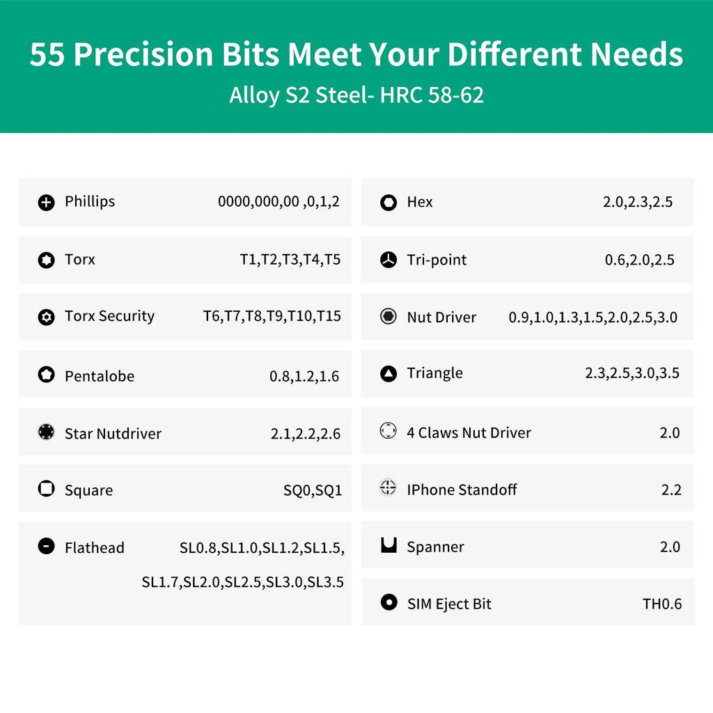 В коплект входит: Доступная по цене ручка из легкого алюминия. 55 прецизионных бит из легированной стали S2, HRC 60±2. Внутренние маленькие магниты для обеспечения магнетизма наконечников при необходимости. Элегантный кейс для хранения бит, предотвращающий их рассеивание и потерю.