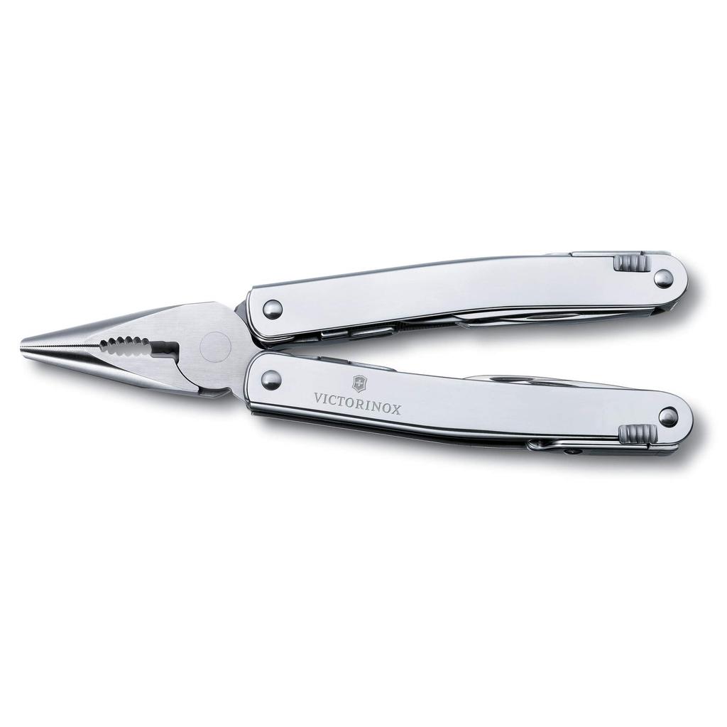 Основные функции: Штопор, Плоскогубцы, Кусачки (для проволоки твердостью до 40HRc), Кусачки для проволоки, Большое лезвие, Ножницы, Пила, Крестовая отвертка 1/2, Развертка (для бурения), Открывалка для консервов, 3 мм плоская отвертка, Открывалка для бутылок, 5,5 мм плоская отвертка, Открывалка для ящиков (лом), Гибочный станок для проволоки (для гибки проволоки), Металлическая пила, Металлический напильник, Плоская отвертка 2,5 мм, Стамеска 7 мм, Стриппер для проводов, Скребок для проводов, Шкала (дюймовый), Масштаб (см), Скребок, Битов ключ, Кейс для бит, 0 бита Phillips (отвертка Филлипс), 10 бит Torx, 15 бит Torx, Место для дополнительных бит, Открытая отвертка, Штопор,