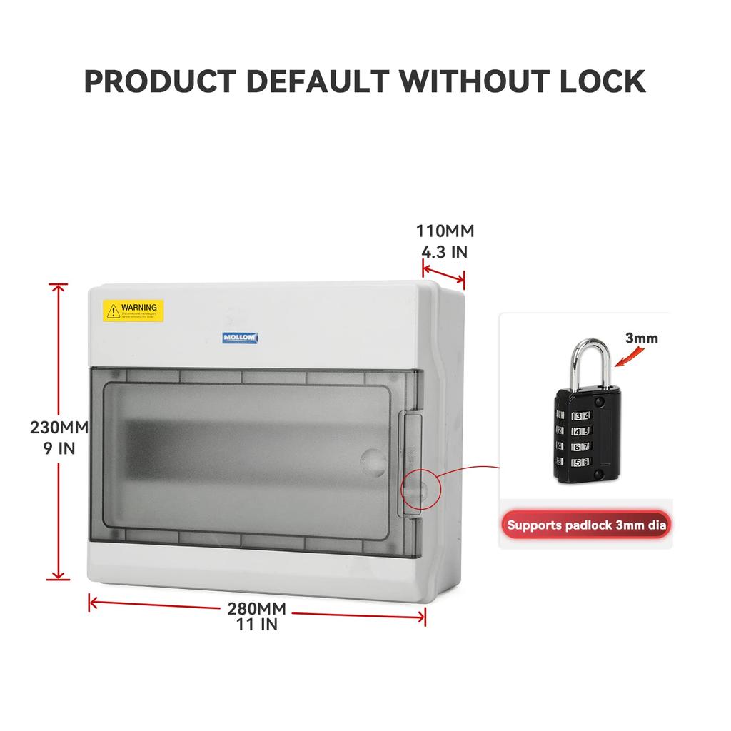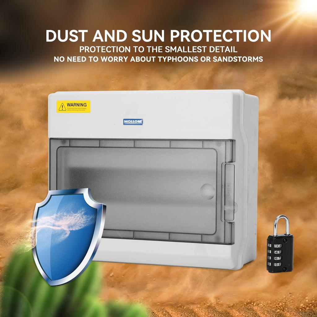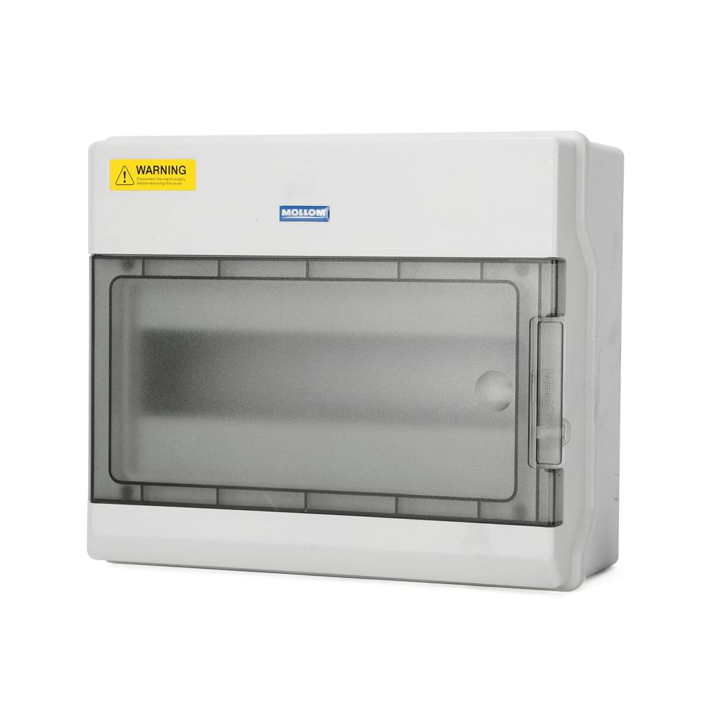 Распределительная коробка Mollom на 12 направлений с шиной и DIN-рейкой для миниатюрных автоматических выключателей (Автоматические выключатели), Водонепроницаемый IP66, Запираемый навесным замком, Для использования в помещении/на улице