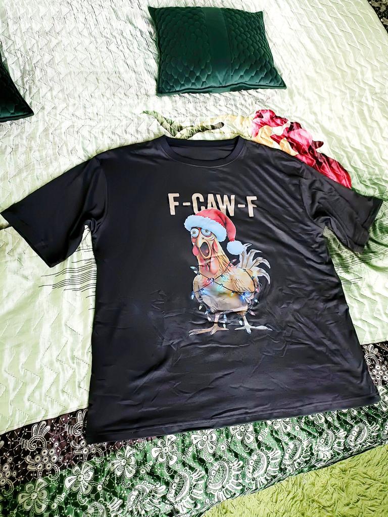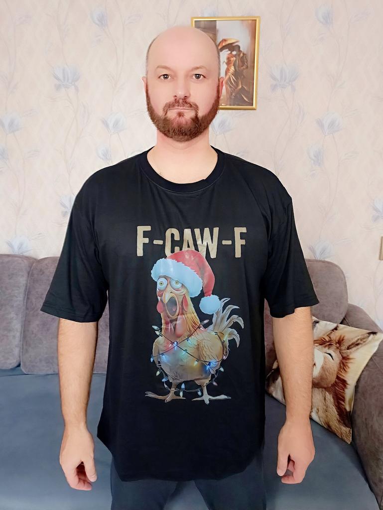 🤩 КЛАССНАЯ ЧЁРНАЯ НОВОГОДНЯЯ ФУТБОЛКА В СТИЛЕ ОВЕРСАЙЗ, ЗАКАЗАЛ СЕБЕ 💯👍 🙋♂️ Всем привет! Я решил обновить себе гардероб на 2026-й год, и заказал на Джум много всякой одежды и обуви. В том числе несколько футболок, включая вот такую, новогоднюю. Казалось бы, зачем? Ведь праздники давно прошли. Но ведь будут новые!!! Учитывая, как быстро летит время, я потихоньку прикупаю всякие интересные товары уже к следующим праздникам. 🎄🎅 Срока годности у этих товаров нет, кушать они не просят. Цены сейчас намного ниже, покупать такие товары очень выгодно. Уберу эту футболку в шкаф, а перед праздниками достану и надену. Доставка до Краснодара всего 18 дней, трек полностью отслеживался. Упакована футболка в фирменный пакет с зип-застёжкой. Вещь абсолютно целая и невредимая. Качество изготовления замечательное. 🕵️♂️ Швы ровные, полностью обверложены. Нитки нигде не торчат, изнанка идеальная. На картинках футболка сидит свободно на юноше, я так и хотел. По размерной сетке продавца подбирать невозможно от слова совсем, так как цифры абсолютно не совпадают. В итоге брал просто наобум, и... угадал с размером. У меня российский М (48-50), и чаще всего я беру китайский XL. ‼️ Как правило, их вещи маломерят на два размера. Вот и в этот раз всё совпало - вещь села как раз на меня. Мои параметры: рост 180, вес 86, талия 84-86, грудь 106-108, плечи 112-114. Теперь сравните с тем, какие параметры указаны у продавца. Если бы это было так, я бы утонул в этой футболке! Но нет, всё замечательно. Цвет насыщенный чёрный, материал очень приятный к телу (хоть и указан полиэстер) 🤩 Теперь о принте. На рекламных фото принт намного ярче и интереснее, вживую оказался бледноват. Это единственный минус данной футболки. Впрочем, за эту цену очень даже неплохо. И немного о надписи над петухом-Сантой. F-Caw-F — это наomatopoeic выражение, которое означает «притворяться, что знаешь, что делаешь, когда на самом деле полностью потерян». 😂 Забавно, правда? У фразы нет буквального перевода, она звучит как странный, уверенный, но бессмысленный крик животного. В данном случае петуха. F-Caw-F стал популярным дизайном для футболок и других товаров, так что с этой футболкой я теперь в самом тренде. И этим фактом я очень доволен. За бледный принт баллы не снижаю, потом что в целом считаю эту покупку весьма удачной. 👍 Рекомендую всем желающим! Потраченных денег не жалко. Обязательно закажите, Вам понравится. Благодарю за внимание к моему отзыву и до новых встреч! Бюджетно и достойно, без вопросов. Не забывайте ставить лайки, если обзор оказался интересен и полезен! Хотите ещё более выгодную покупку? Кидаю свой личный промокод на скидку: GJNH6CYL7V