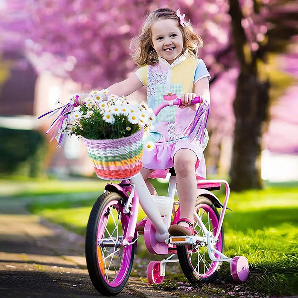 Корзина для велосипеда радужных цветов для ребенка, передняя корзина на руль из ротанга для пикника, пластиковая велосипедная сумка, держатель для воды, сумка-багажник для велосипеда для кукол