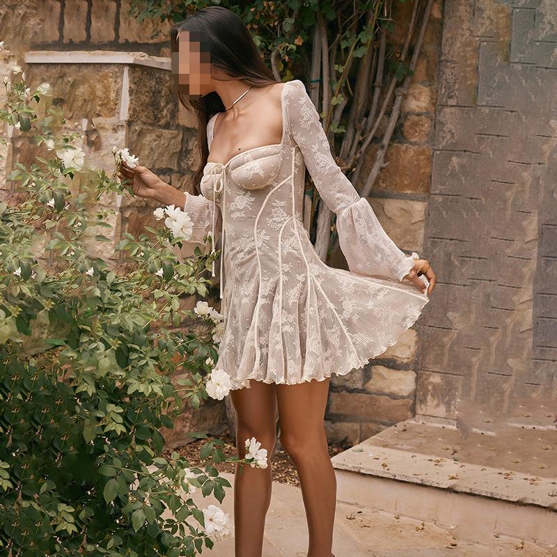 Женское темпераментное модное облегающее платье А-силуэта со шнуровкой, кружевом и длинными рукавами-фонариками
