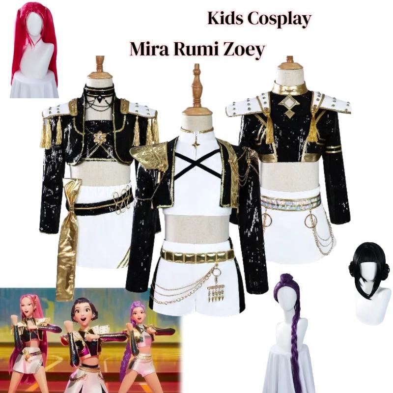 Детский Kpop Костюм Косплей Охотники на Демонов Мира Руми Зои Черный Золотой Сценический Костюм Парик Костюм Наряды для Ролевых Игр для Девочек