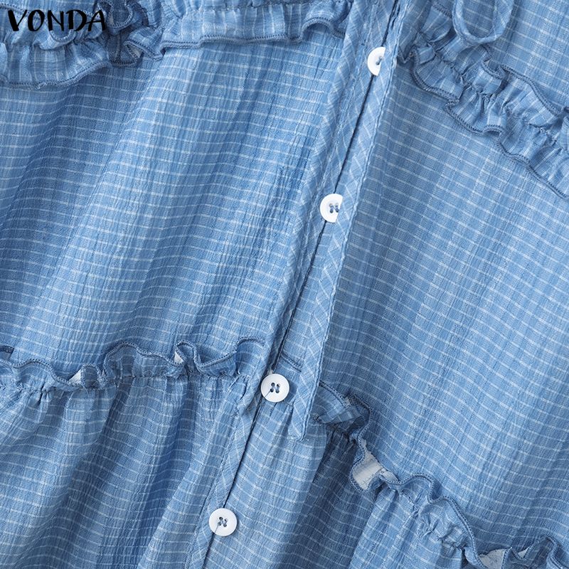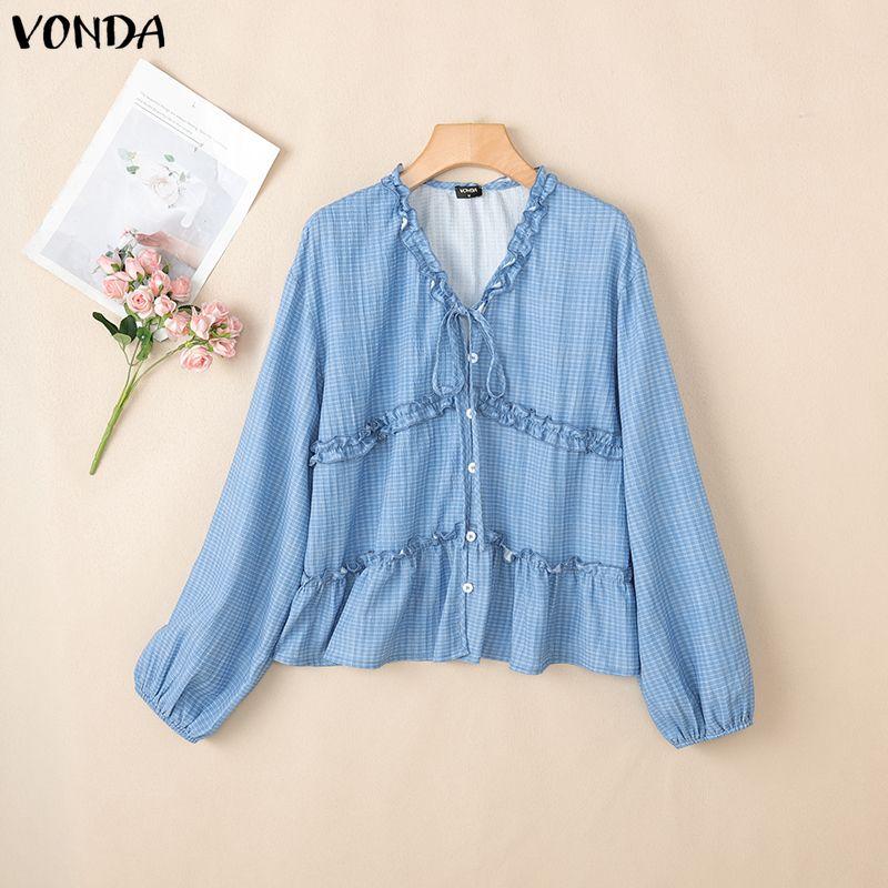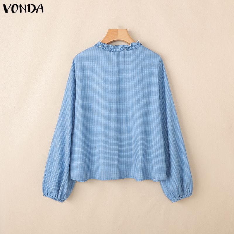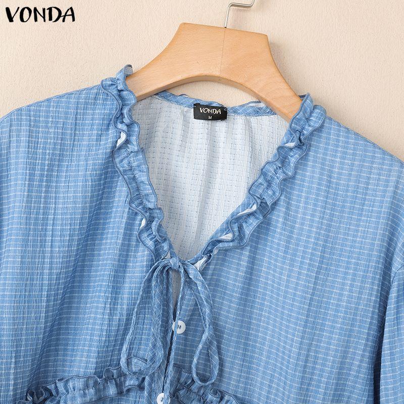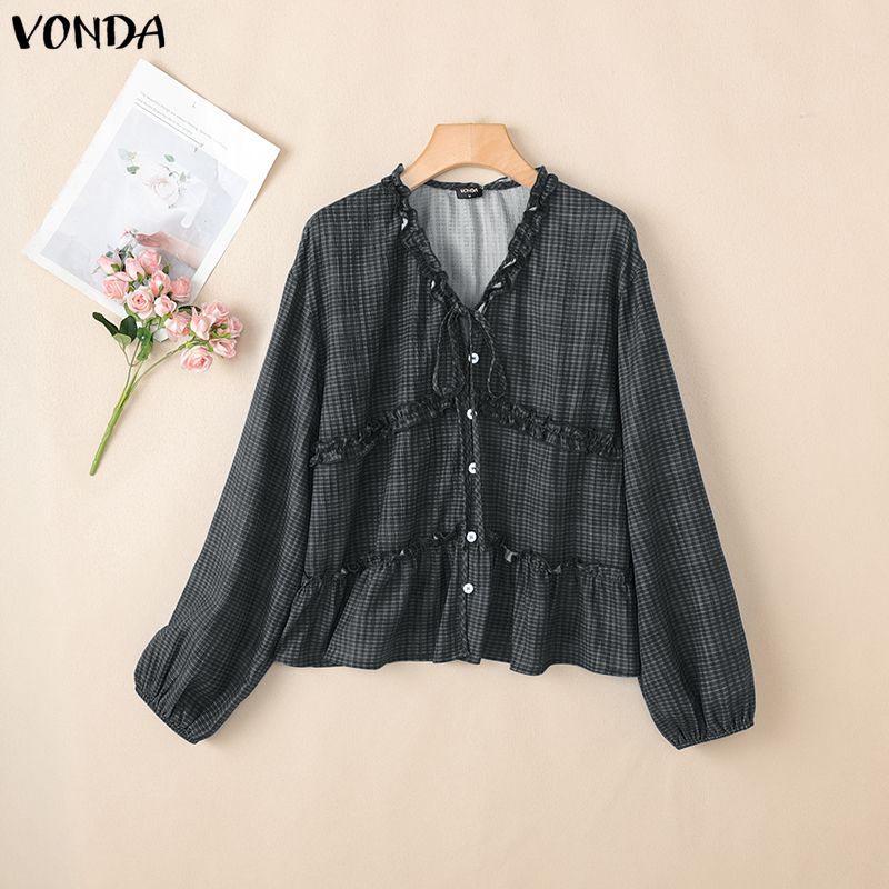 VONDA Женская блузка с оборками, V-образным вырезом, свободного кроя, с длинными рукавами и принтом в клетку