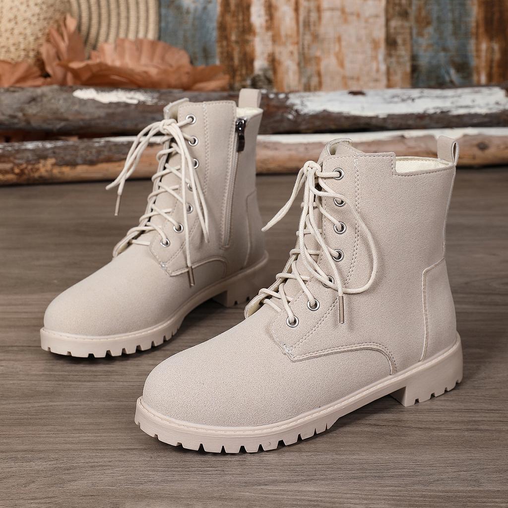 Ретро Однотонные Ботильоны на Молнии для Женщин Осень Зима Квадратный Каблук Шнуровка Женские Ботинки Большой Размер Обувь Женская с Круглым Носком