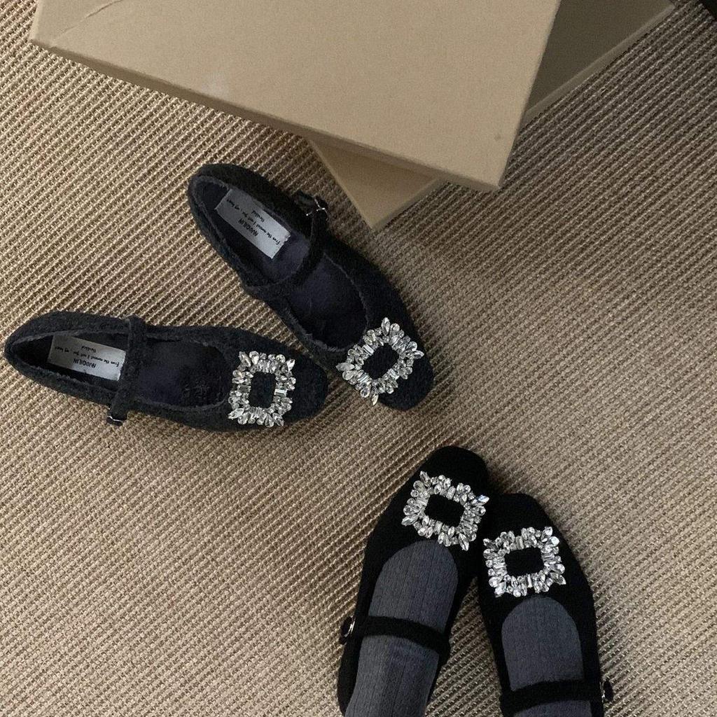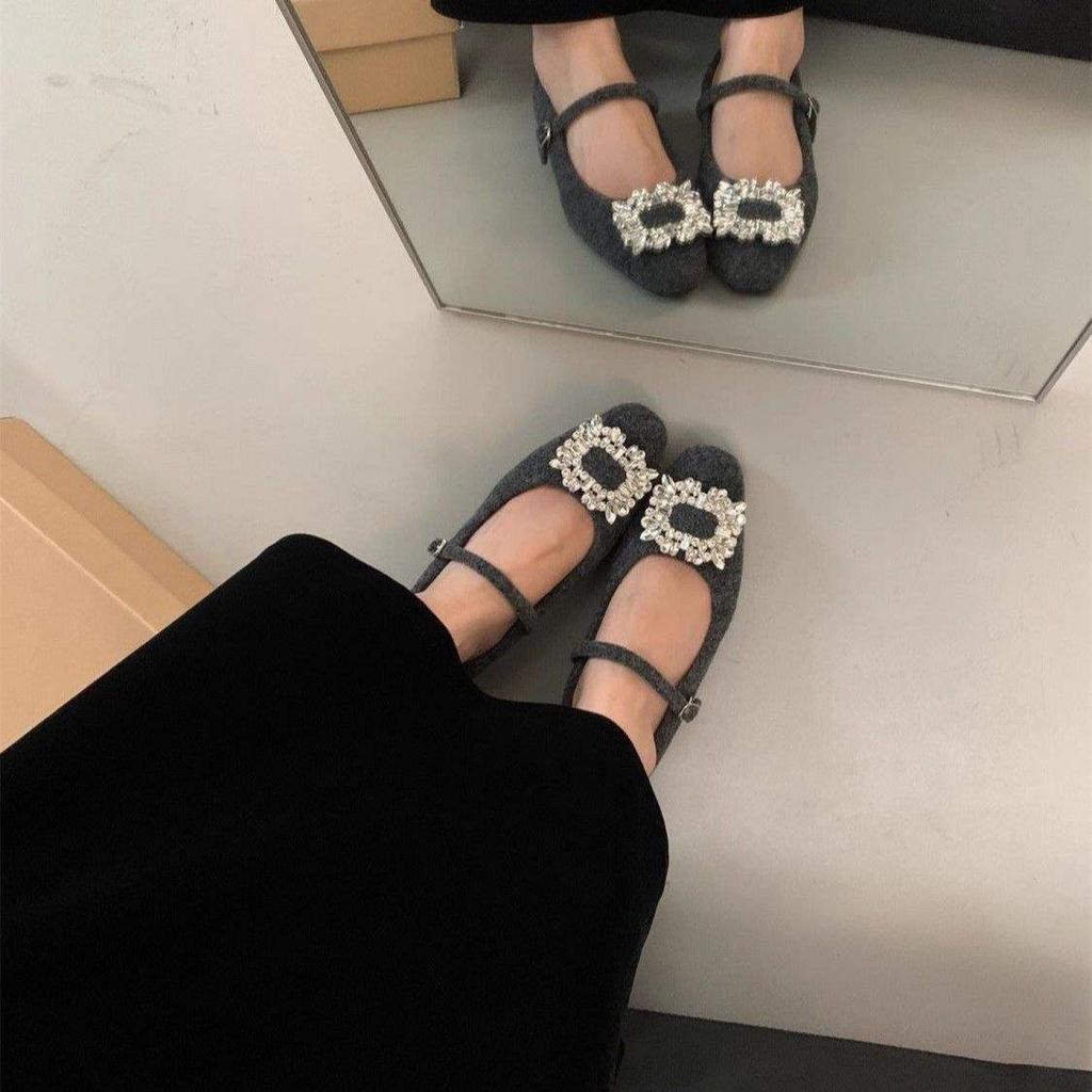 Серые туфли Мэри Джейн на плоской подошве со стразами для женской зимней одежды, новая корейская версия шерстяных одинарных туфель с квадратным носком, бархат т