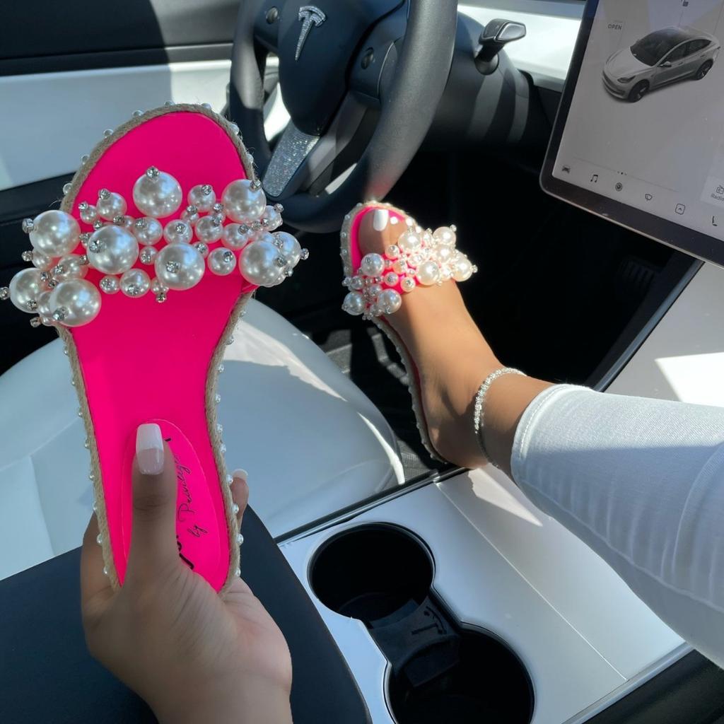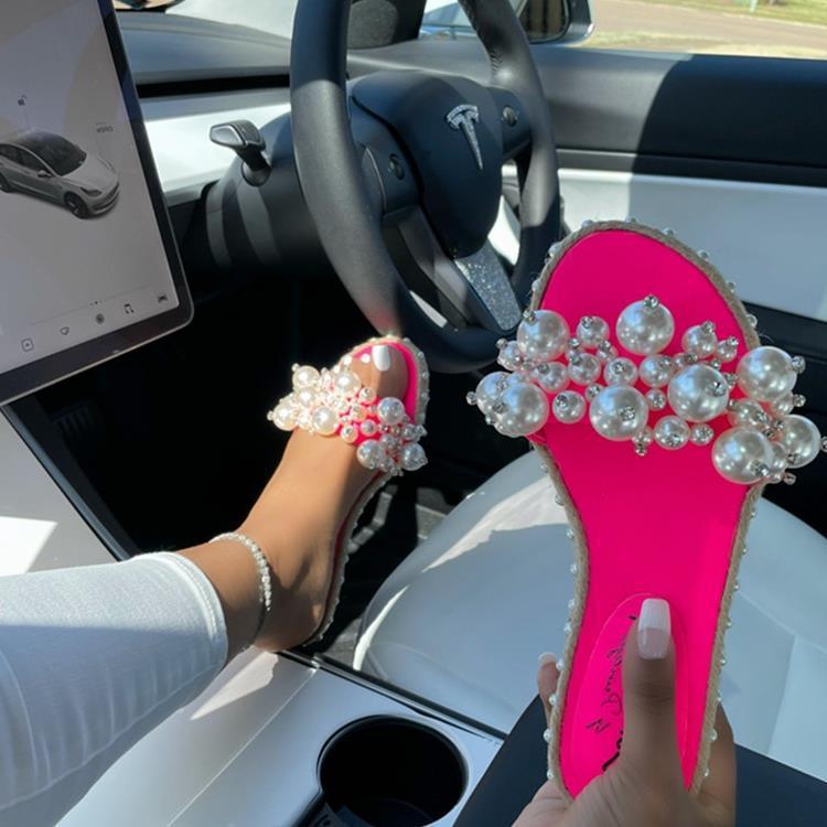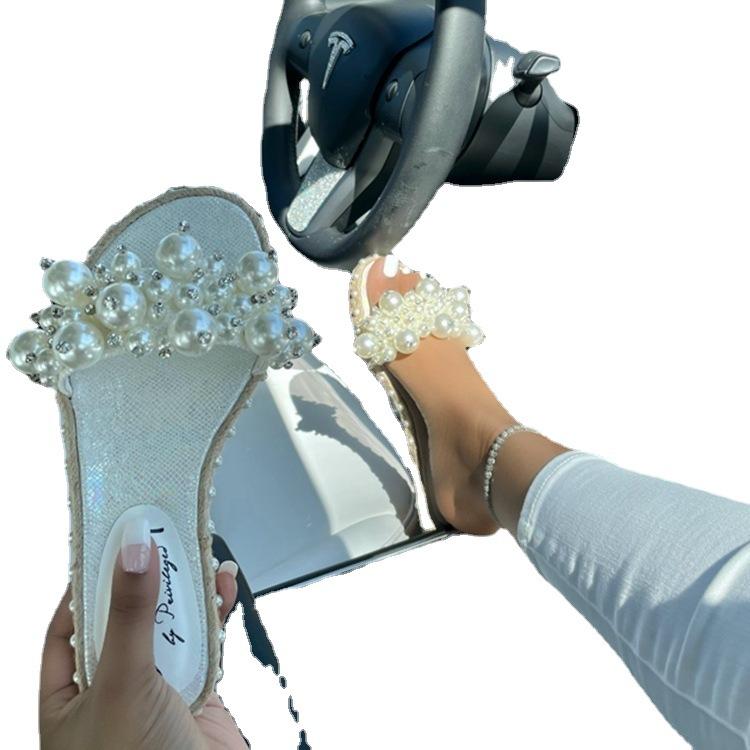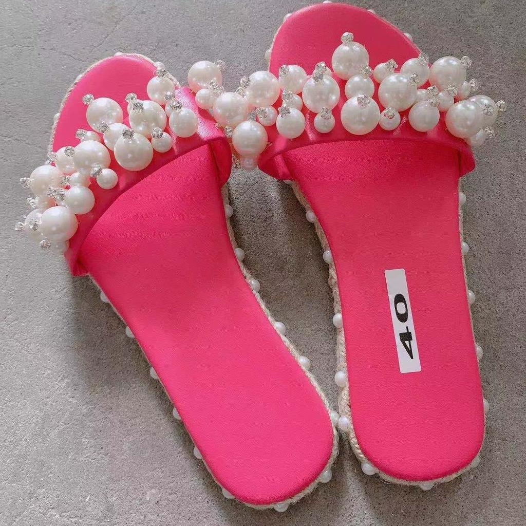 Europe, America 2021 summer new one-word drag pearl fashion sandals flat large size shoes light casual versatile