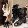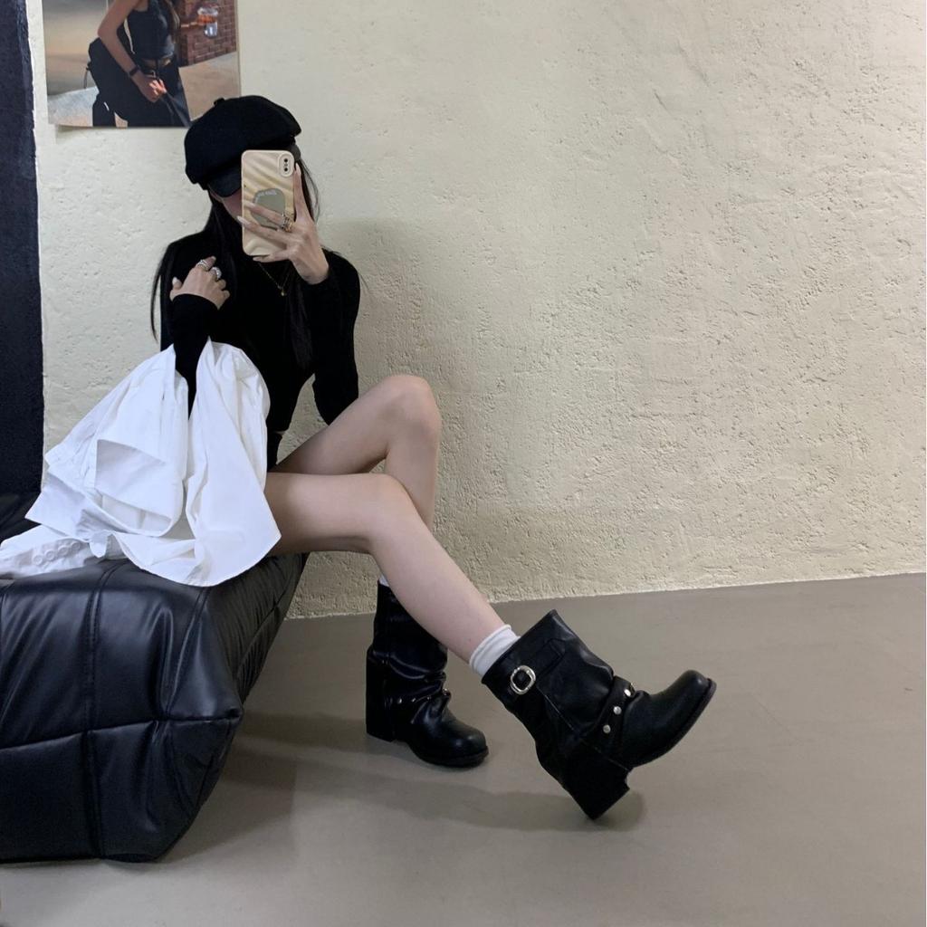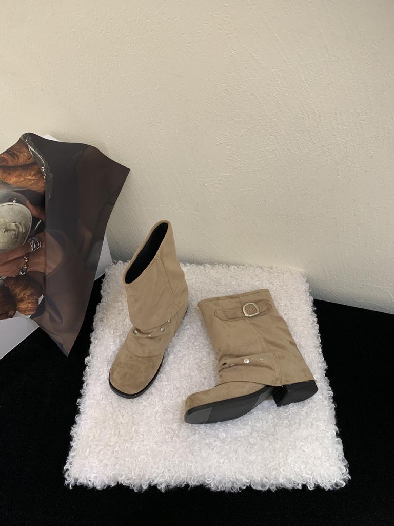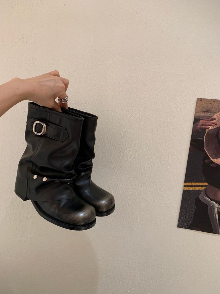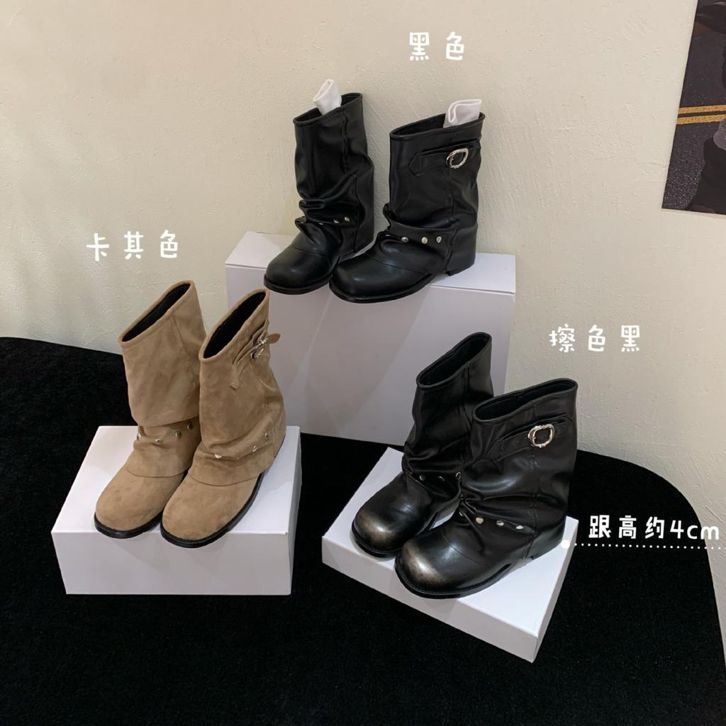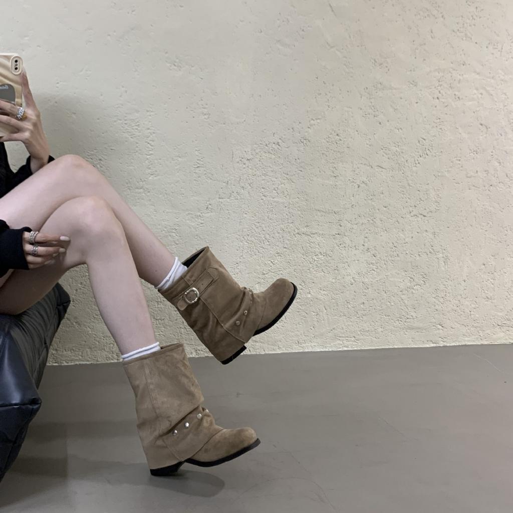 Женские полусапоги в стиле западного ковбоя 2025 новая плиссированная обувь короткие сапоги полированные ретро сапоги рыцаря