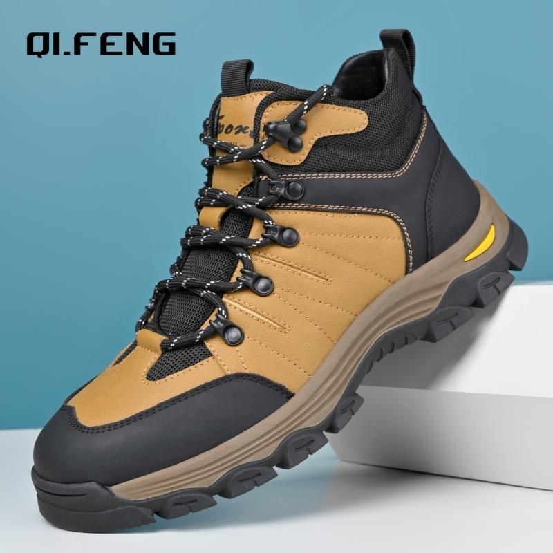Large Genuine Leather High Top Casual Shoes Men Outdoor Travel Hiking Mountaineering Shoes Anti Slip Wear-Resistant Sneaker
