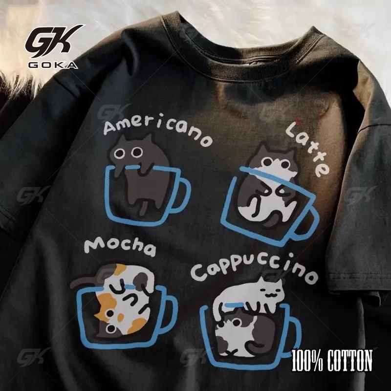 Мужская повседневная футболка из 100% хлопка с принтом кофейного кота на лето, новая, свободного кроя, оригинальная, для пары котов, студенческая, с круглым вырезом