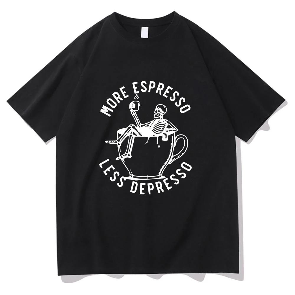 Летняя мужская футболка с коротким рукавом из 100% хлопка с принтом скелета, пьющего кофе, в стиле хоррор, с надписью Summer men's more espresso less Depresso — купить товар онлайн с бесплатной доставкой по всему миру!