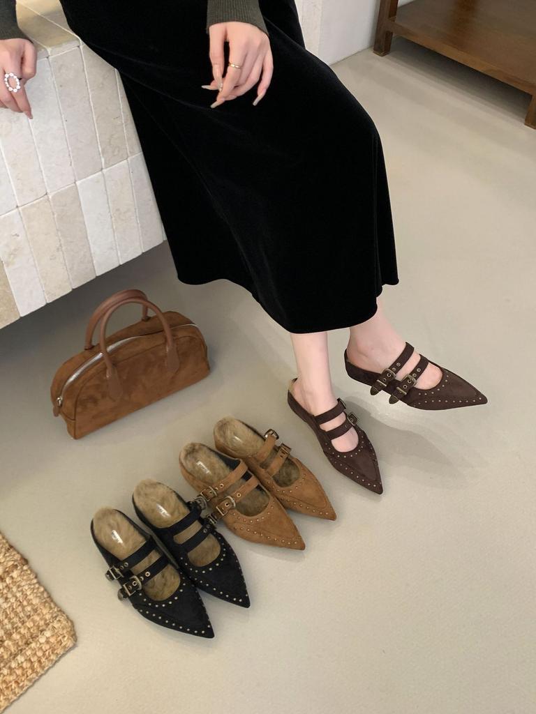 Туфли Мэри Джейн на скрытой платформе женские 2025 осень и зима новые заклепки с острым носком модные шлепанцы