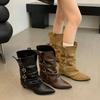 Осень 2025 новые ботильоны с острым носком, толстым каблуком, средней высотой каблука, коротким плиссированным голенищем для женской одежды с пряжками-ремнями и низким каблуком