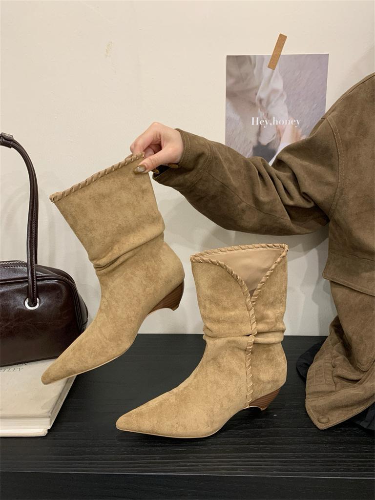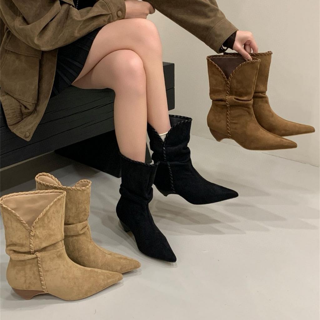 Каблук Заостренный Замшевые Ботильоны Средние Рыцарские Сапоги Женские Сапоги 2025 Осень/Зима Западные Ковбойские Облегающие Сапоги