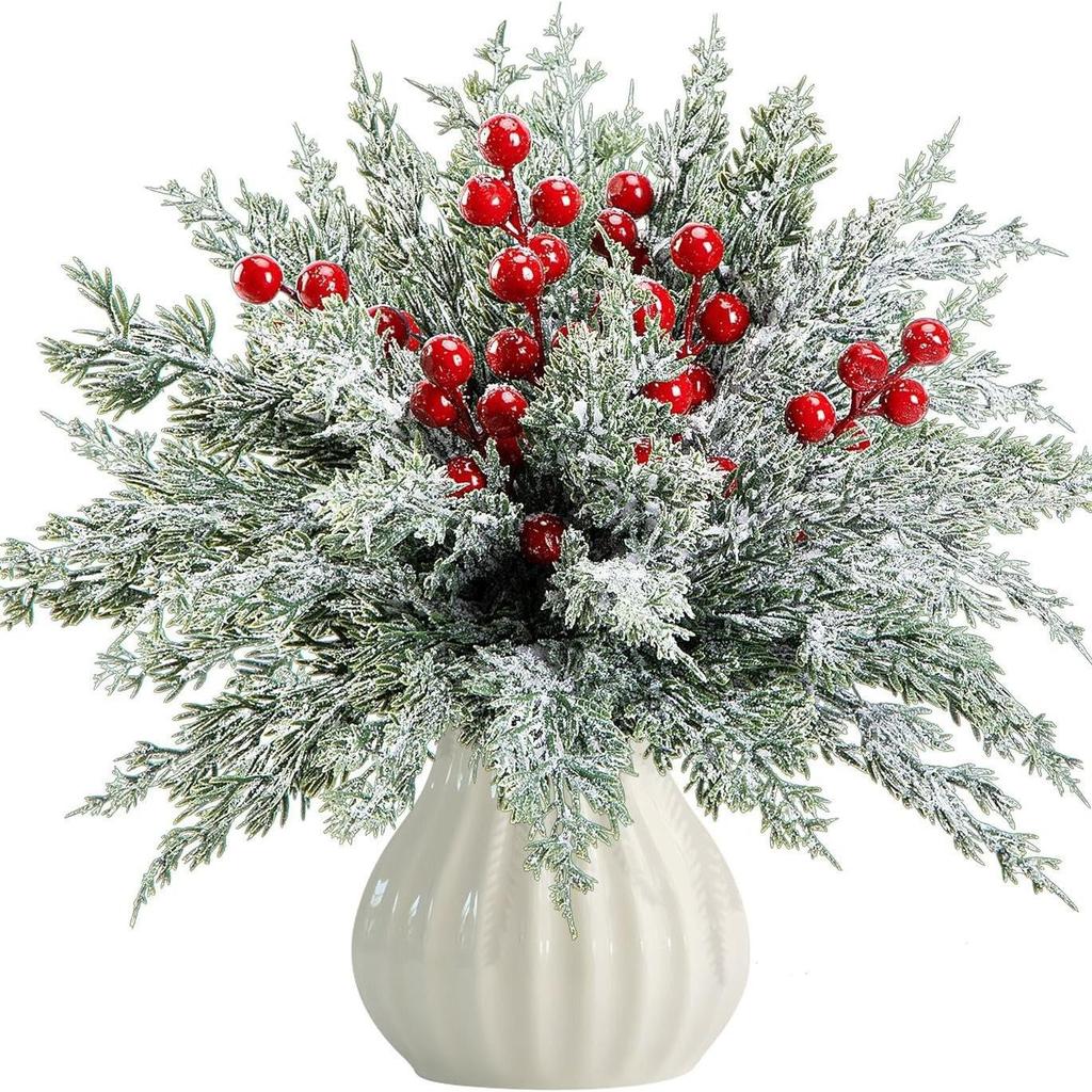 Ветки сосны и кипариса с красными ягодами и зелеными растениями: Центральная часть рождественского стола