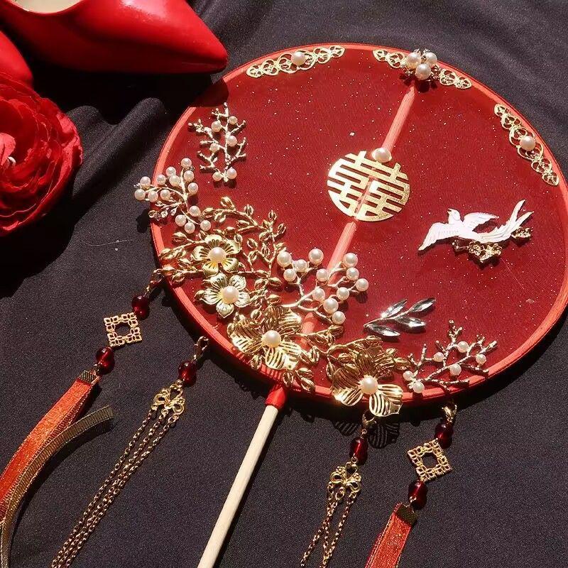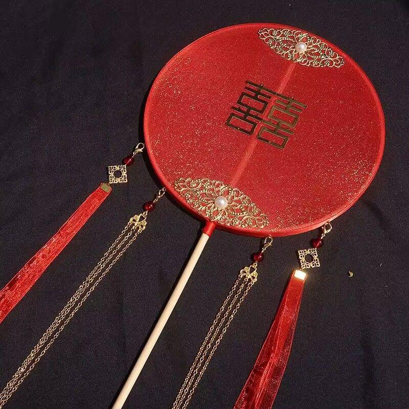 Красный свадебный круглый веер в древнем стиле с длинной ручкой - Свадебный подарок ручной работы